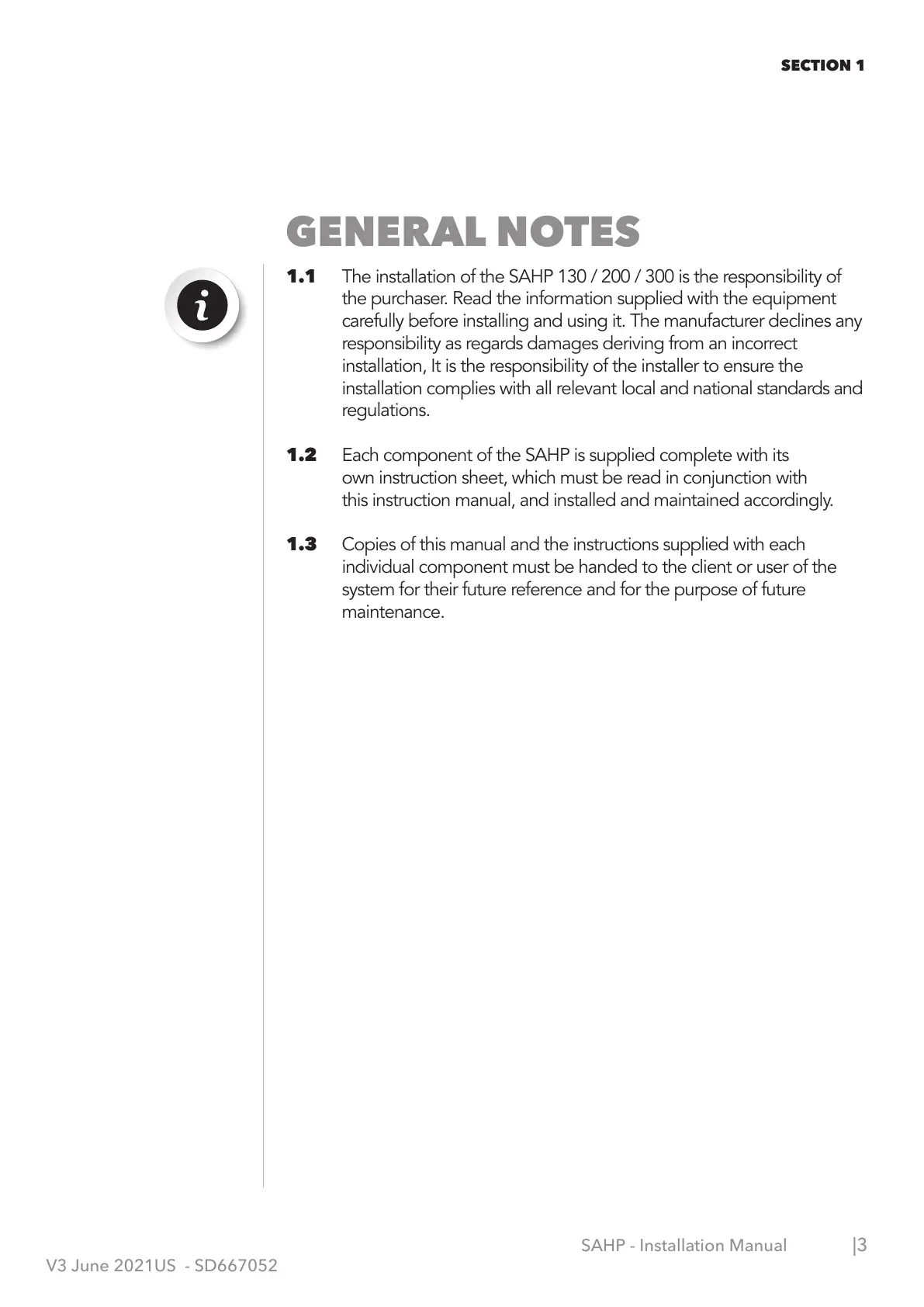 1.1 The installation of the SAHP 130 / 200 / 300 is the responsibility of