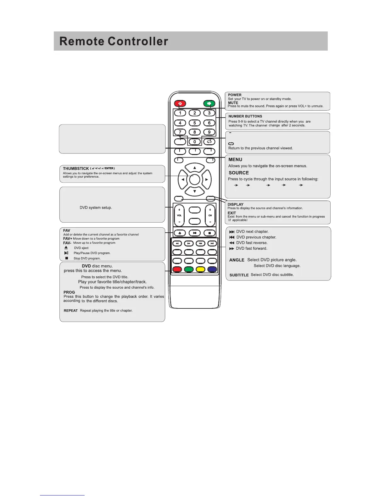 CH +/- : Press to scan through or to select a channel.