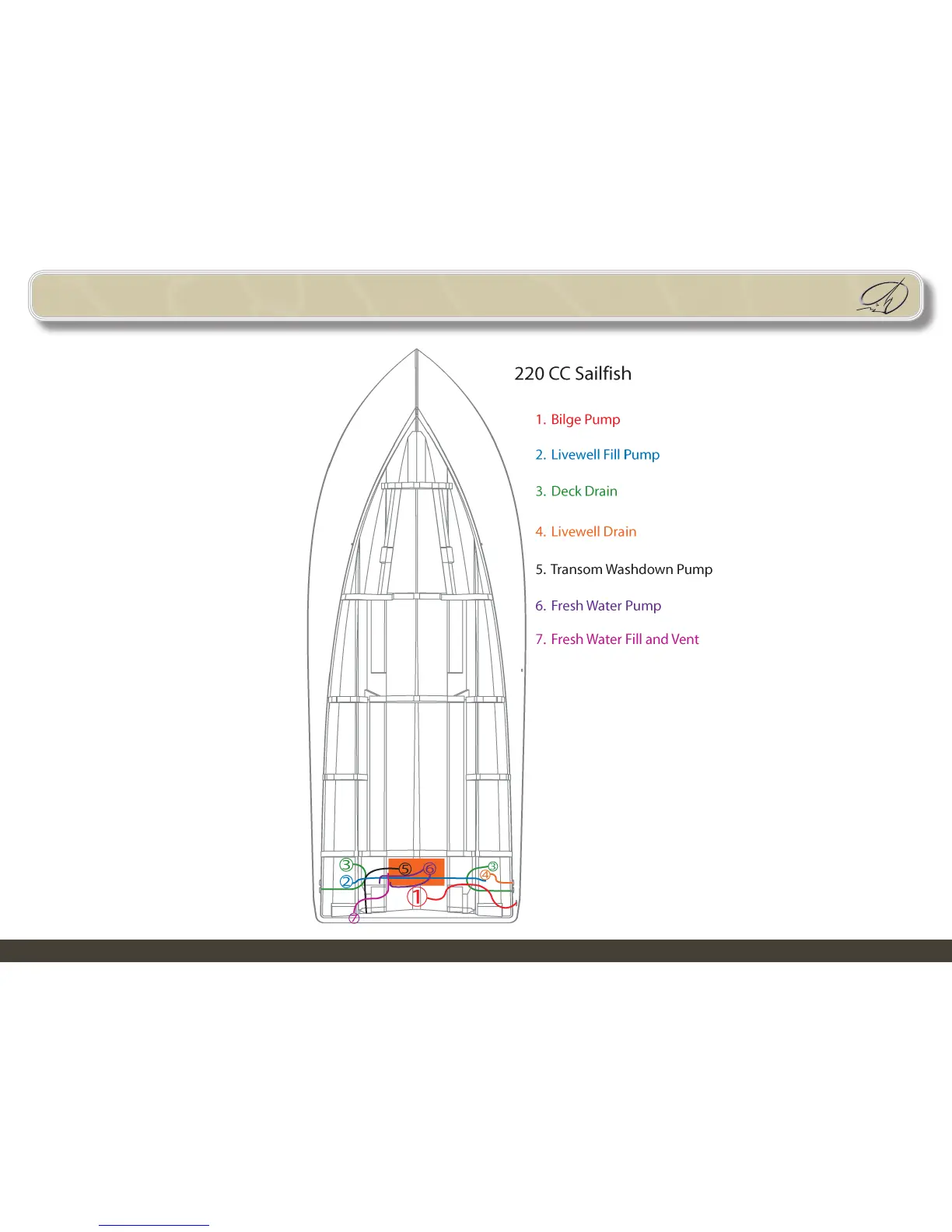 Sailfish 220 CC - Plumbing Diagram - 220 CC; Bilge and Livewell Pumps; Drainage and Washdown Systems; Fresh Water System Components