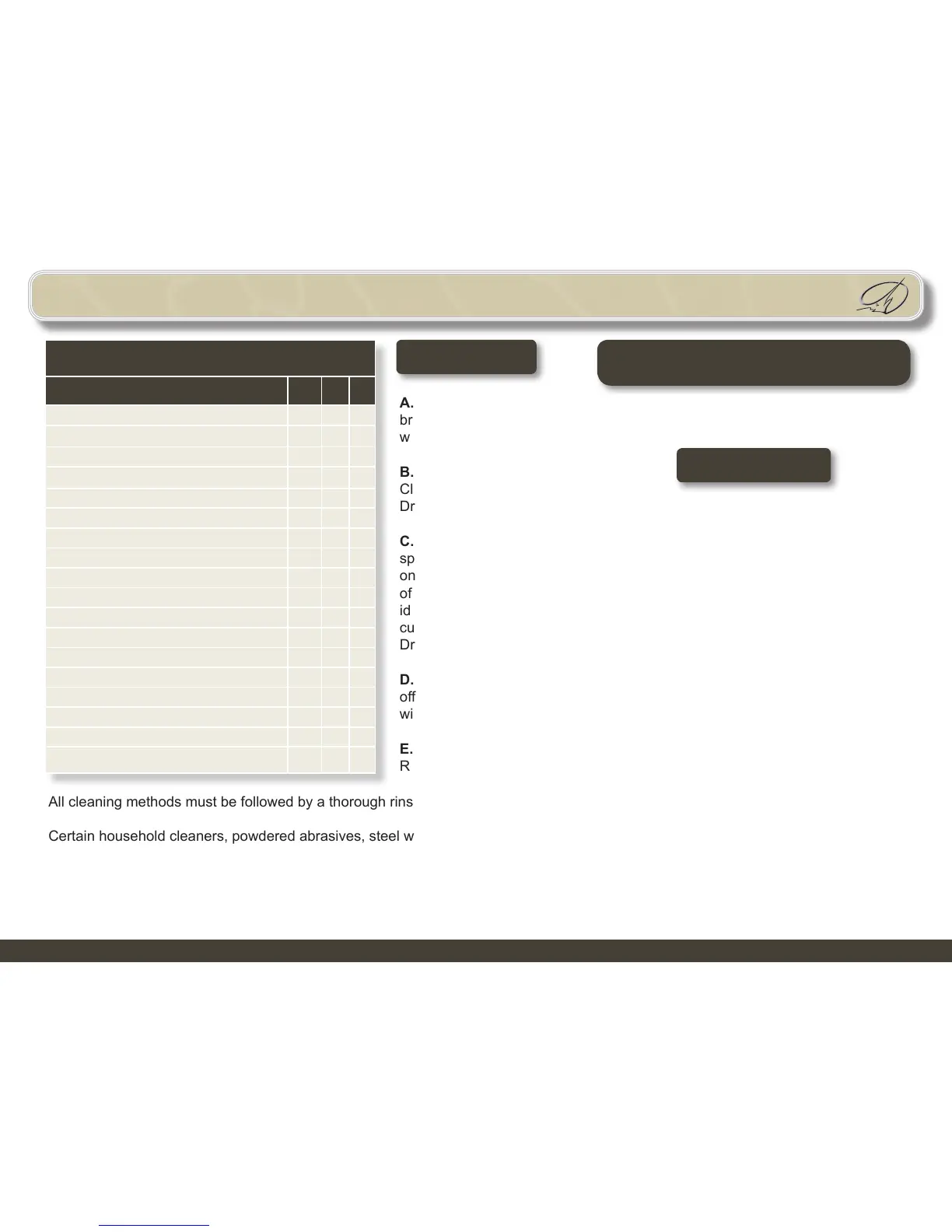 Certain household cleaners, powdered abrasives, steel wool, and industrial cleaners can cause damage and discoloration and are not