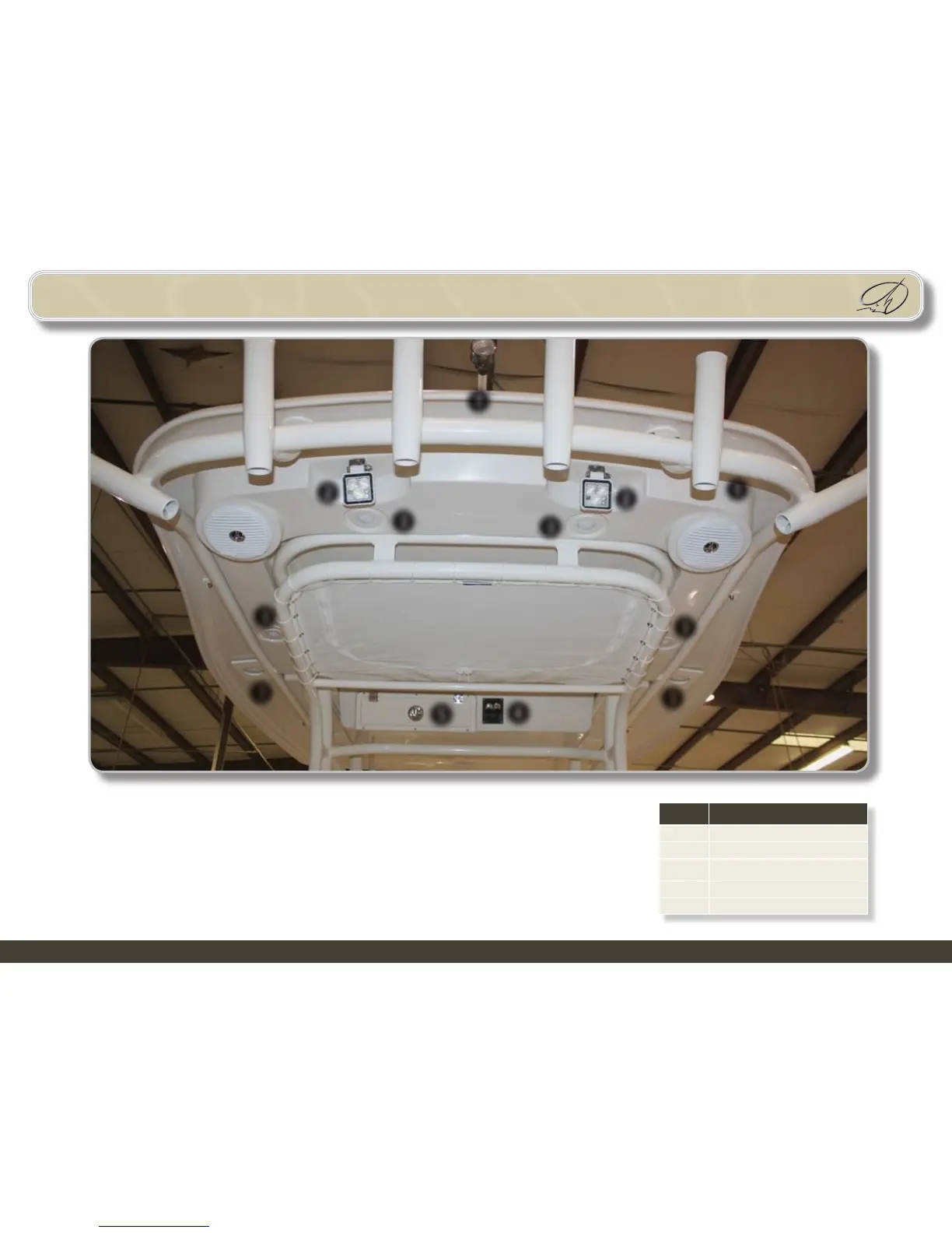 docking lights, an anchor light , two speakers and an overhead storage box.
