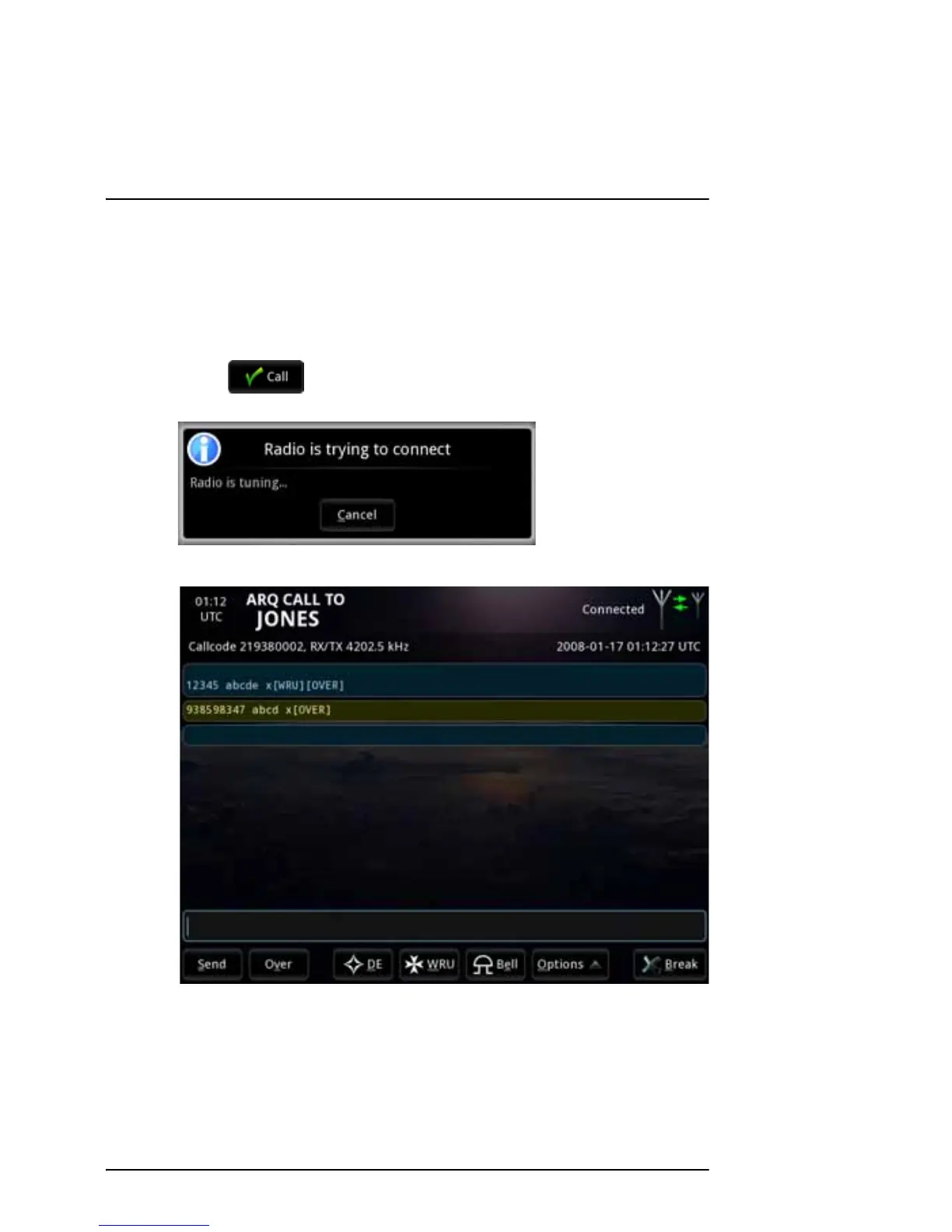 telex session. The display shows that the radio is trying to connect.