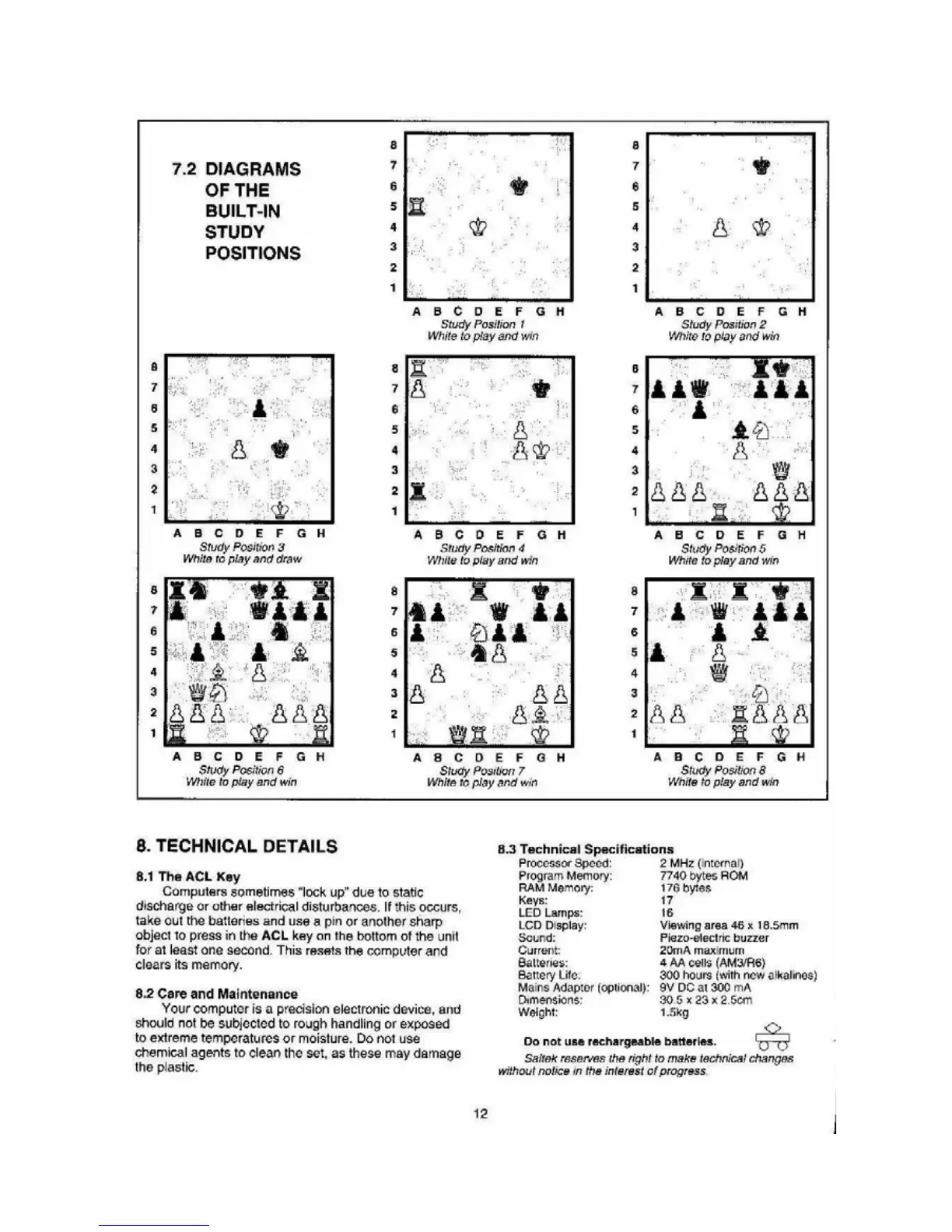 Saitek Olympiad - Diagrams of Study Positions; Technical Details and Maintenance; The ACL Key Function; Care and Maintenance Guidelines