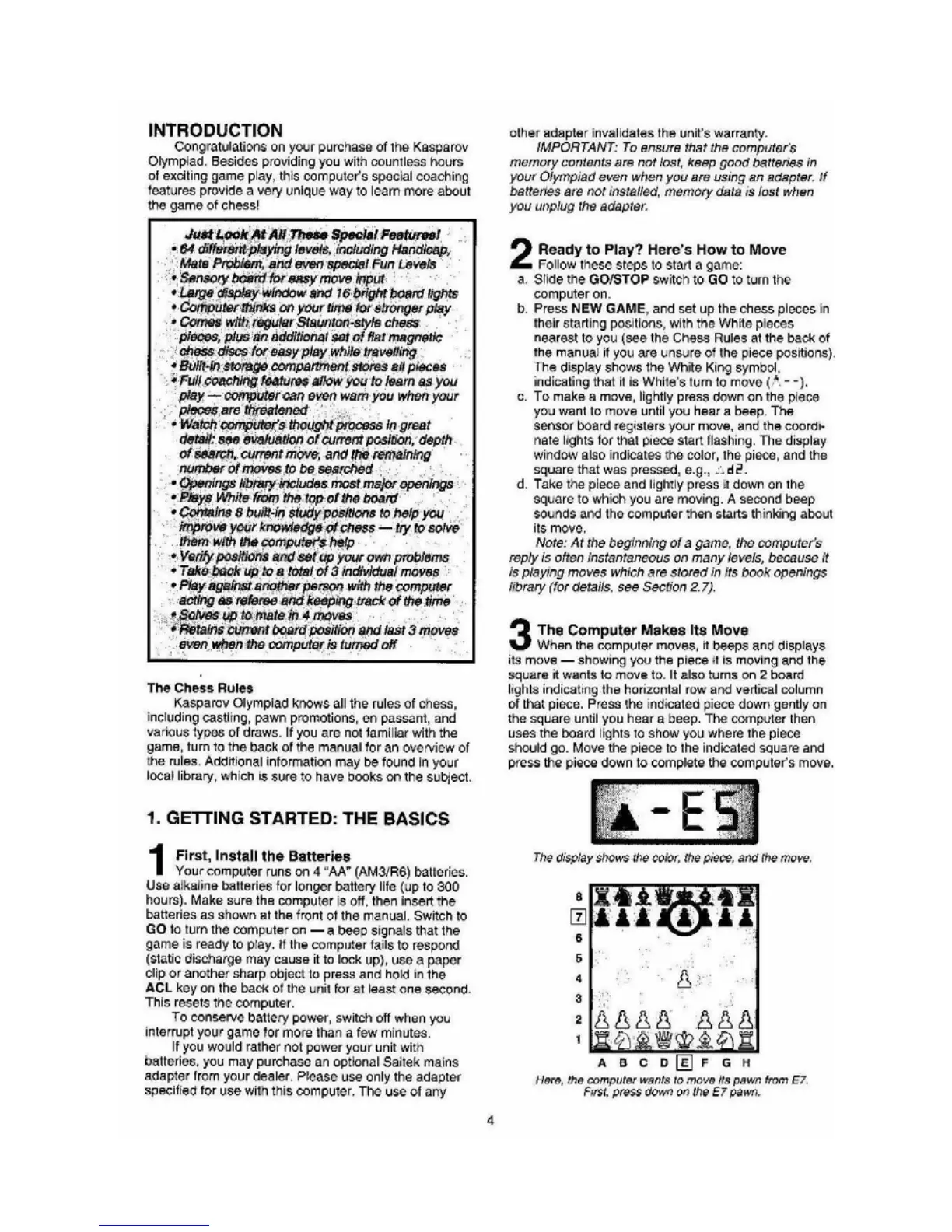 Saitek Olympiad - Introduction and Basics; Installing Batteries and Powering On; Making Your First Move; Understanding Computer Moves