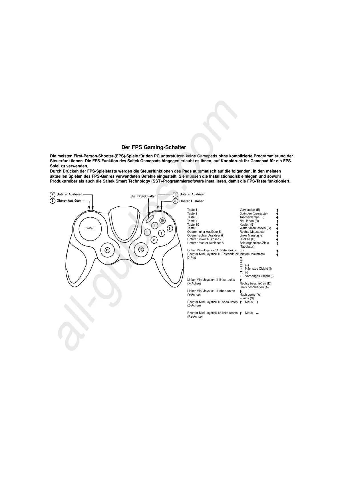 Steuerfunktionen. Die FPS-Funktion des Saitek Gamepads hingegen erlaubt es Ihnen, auf Knopfdruck Ihr Gamepad für ein FPS-