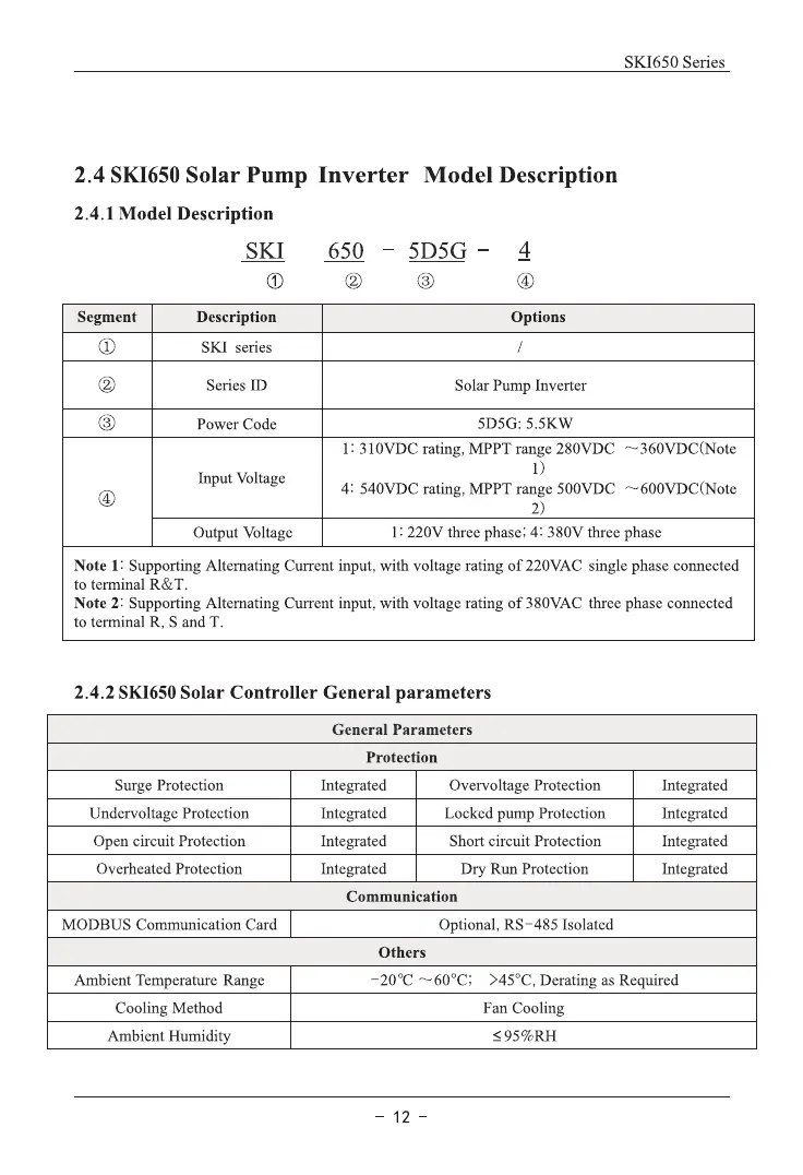 Sako SKI650-2D2G - Solar Controller General Parameters; Solar Pump Inverter Model Description