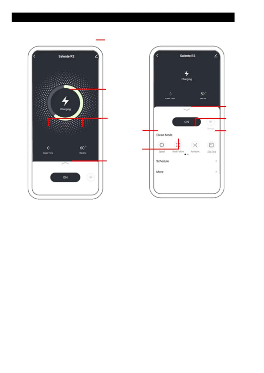 pozdĺž stien, d – režim automatického upratovania, e – režim upratovania kľukatým