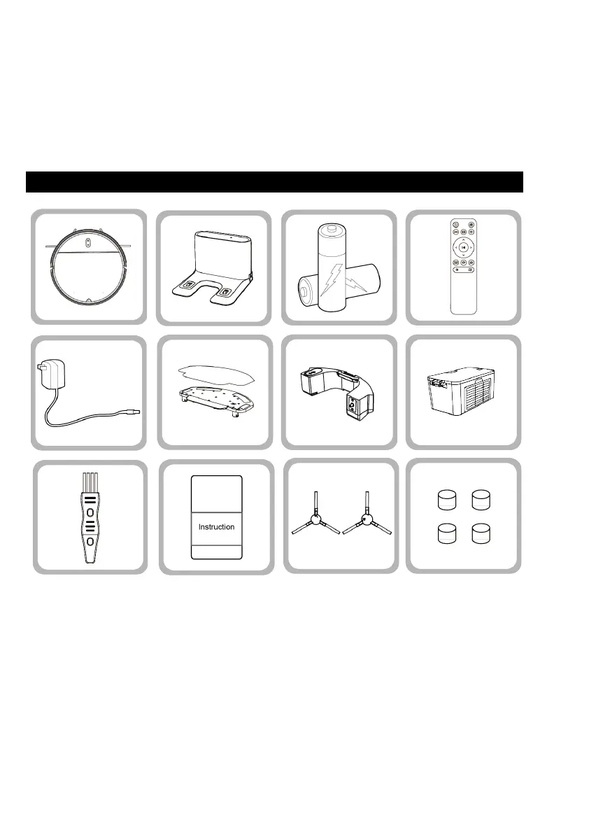 a - 1x vysavač, b - 1x nabíjecí základna, c - 2x baterie, d - 1x dálkový ovladač, e - 1x