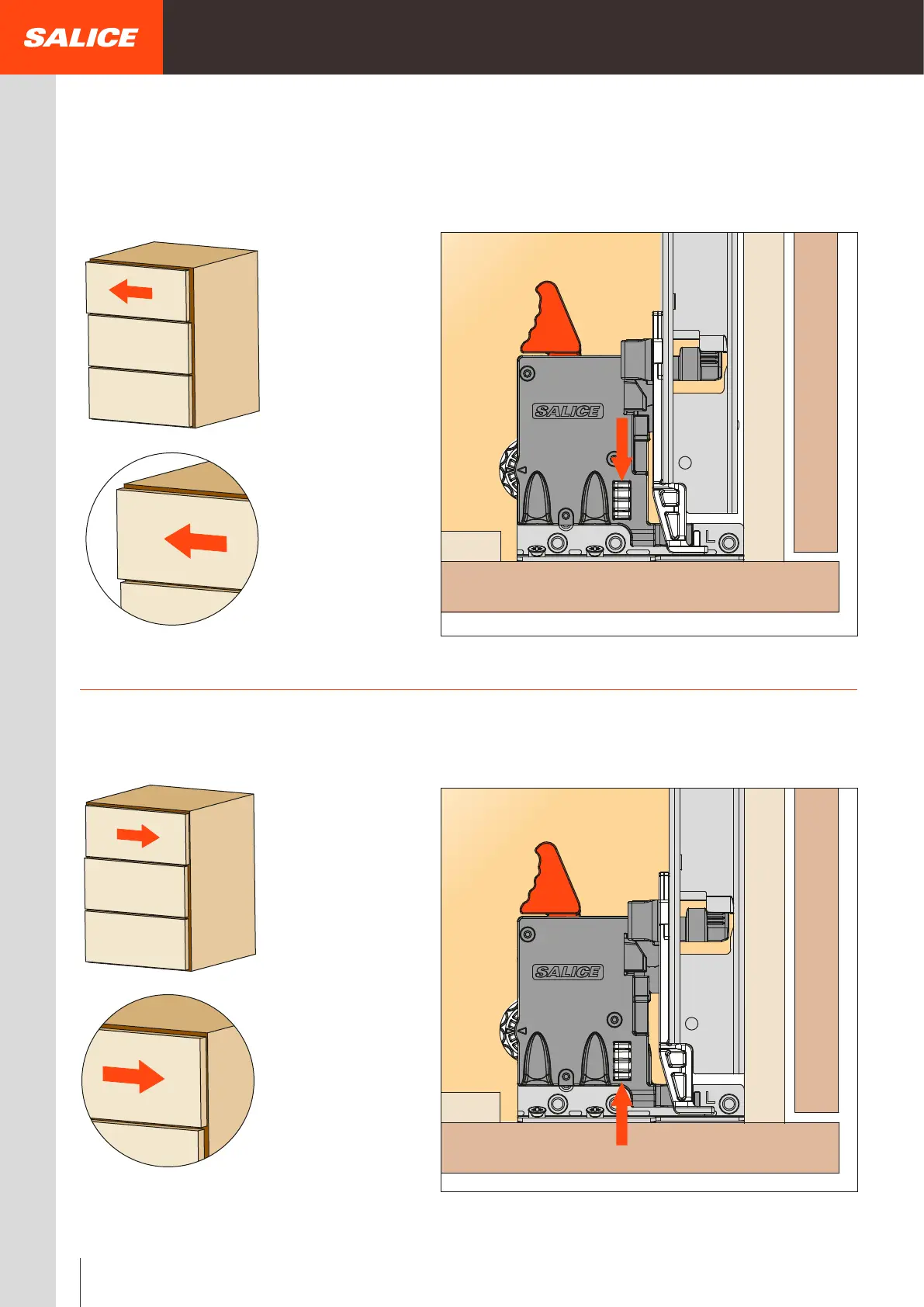 Rotate the white wheel towards the drawer front to adjust left.