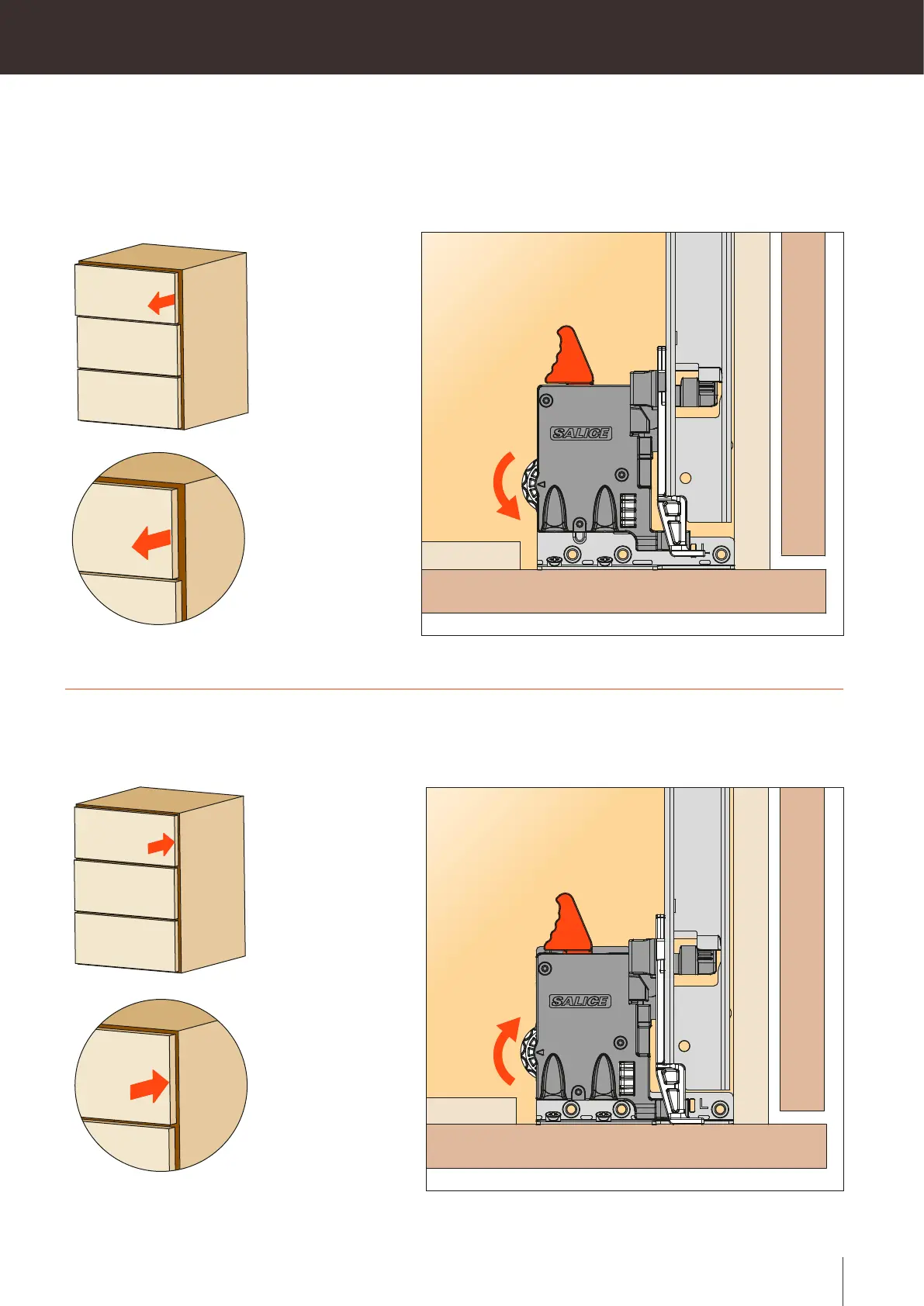Rotate the white wheel (see drawing) towards the inside of the drawer to reduce the gap between the front
