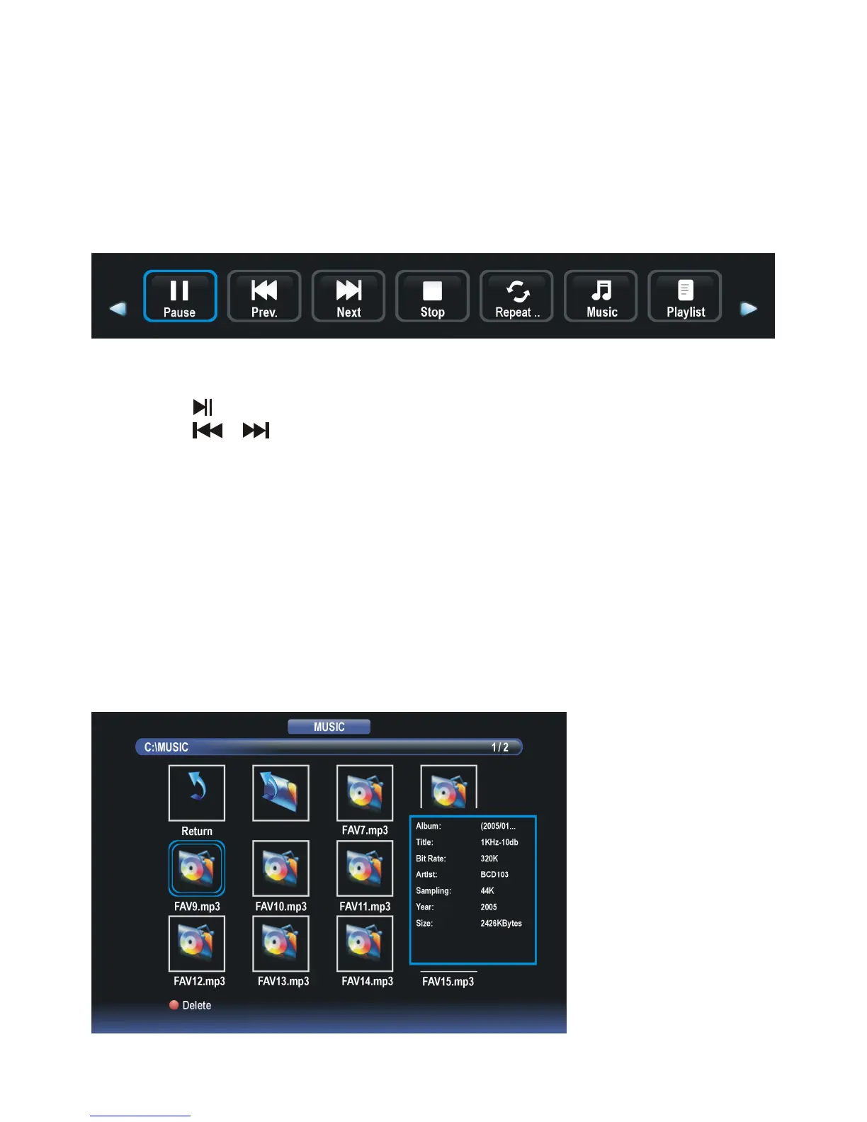 - Druk op de / knop om het vorige/volgende bestand af te spelen.