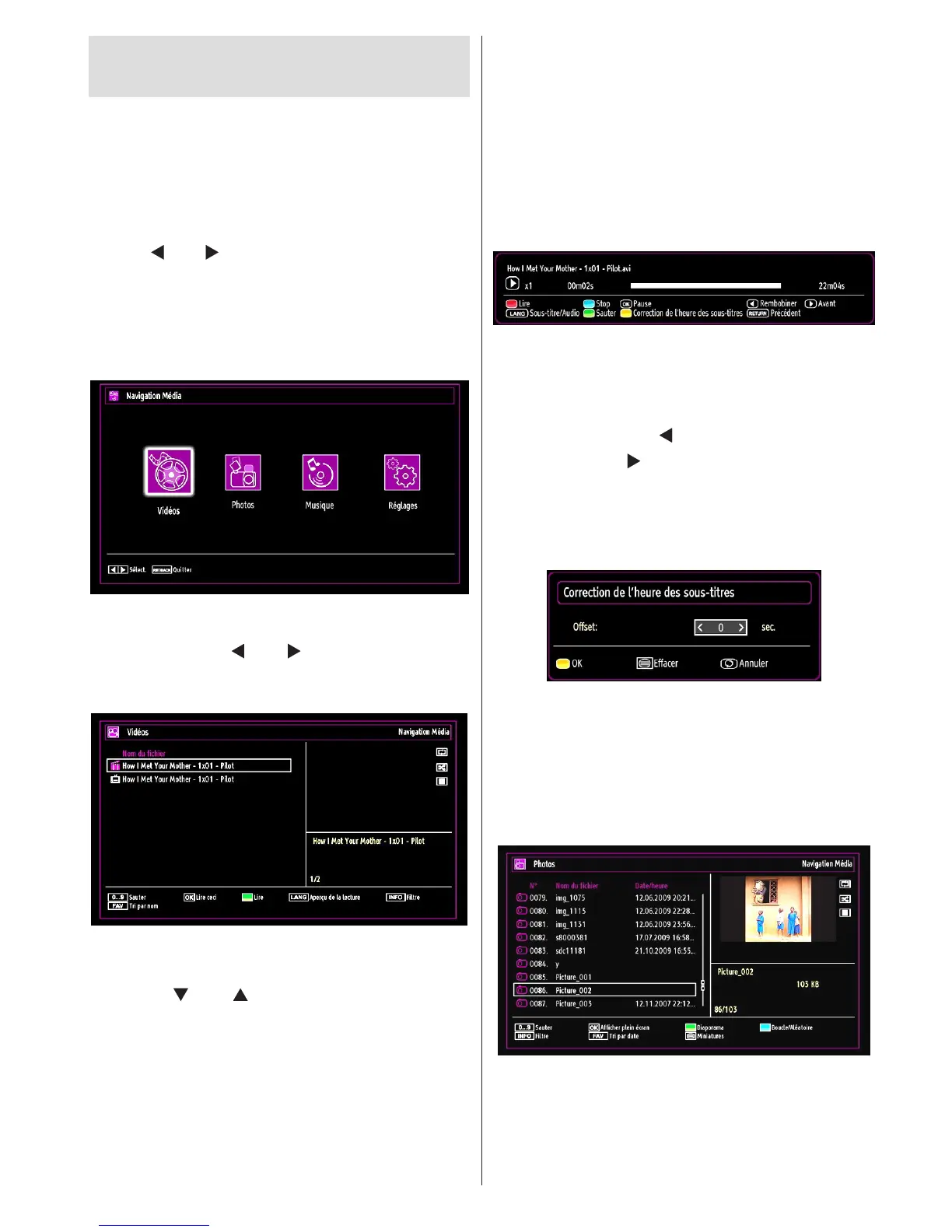 options Vidéos, Photos, Musiques or Réglages.