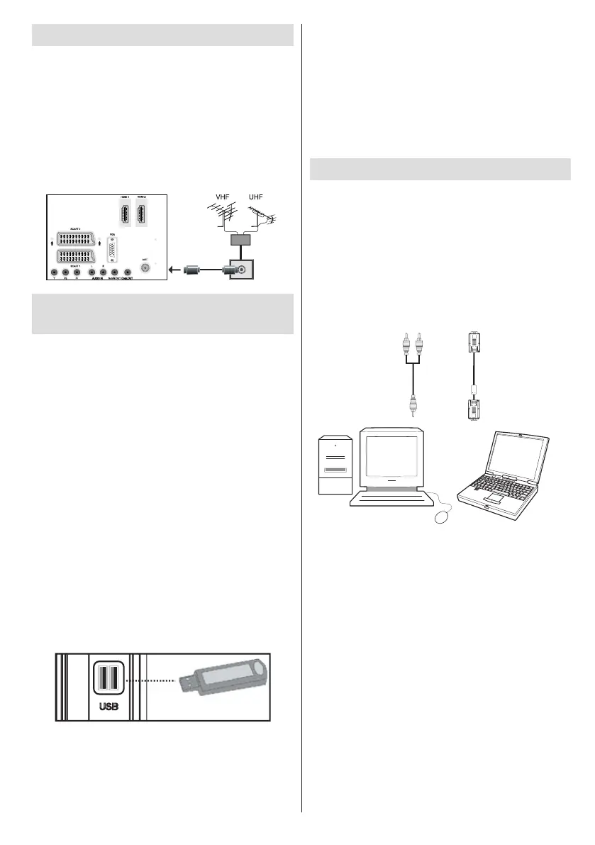 Sluit de antenne of de kabeltv-stekker aan op de •