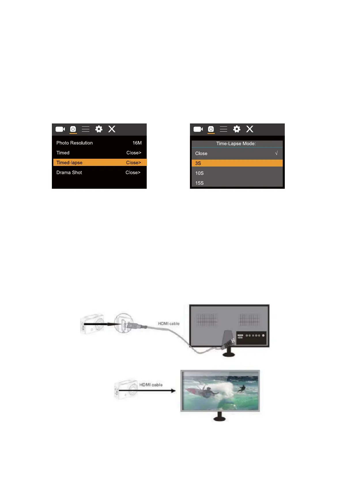 When the camera is connected with the HDTV successfully, the camera display will be