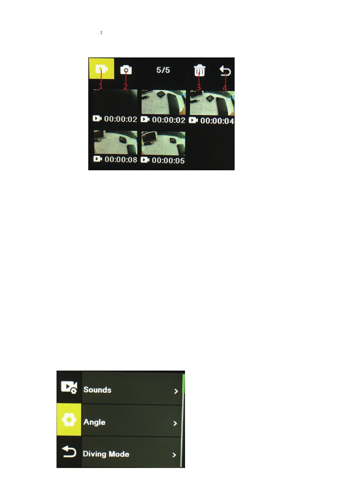 3) Delete: After opening the video or photo album, press the up/down button to select the