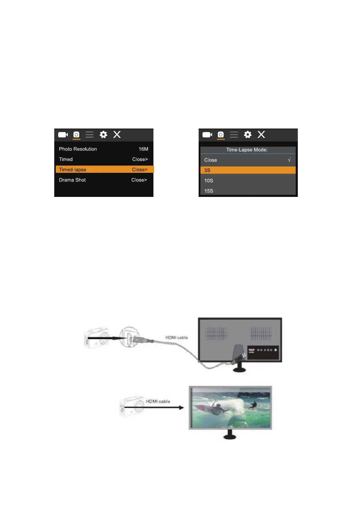 When the camera is connected with the HDTV successfully, the camera display will be