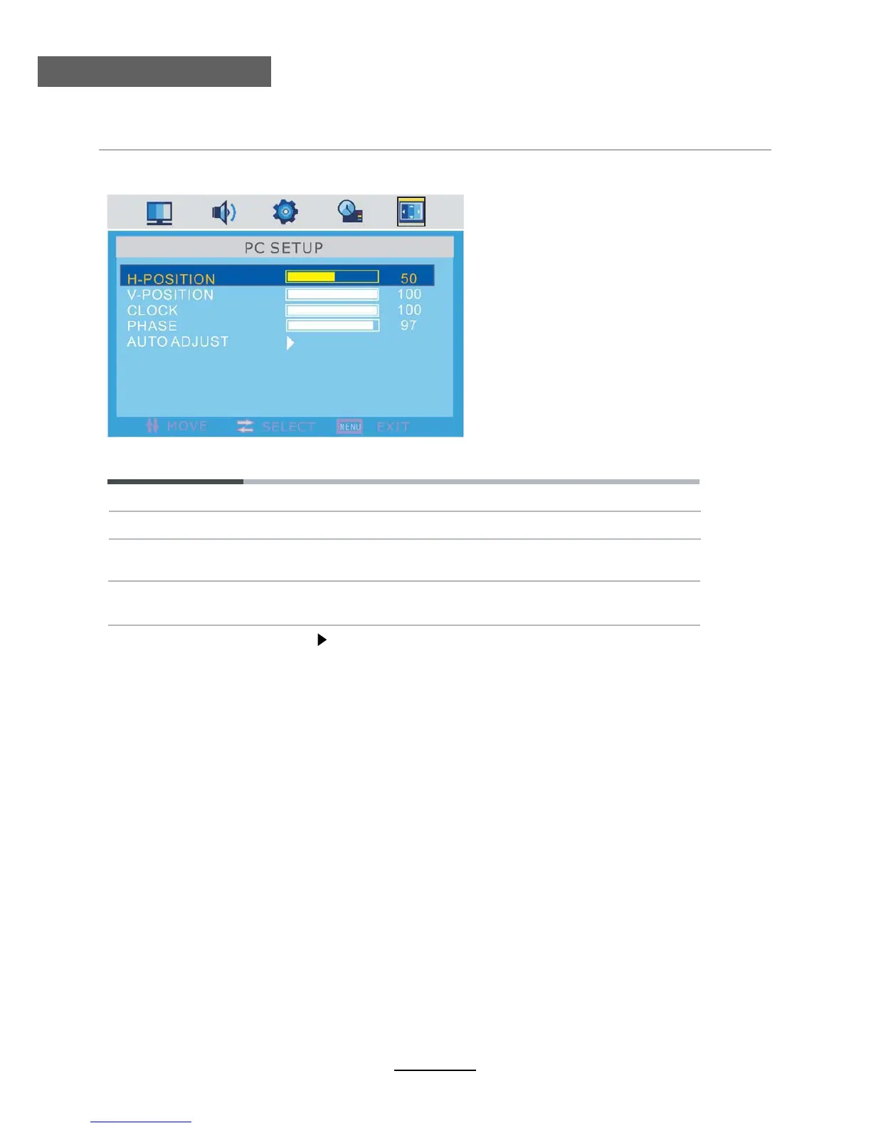 Auto Adjust Press button to setup the parameter of the screen automatically.