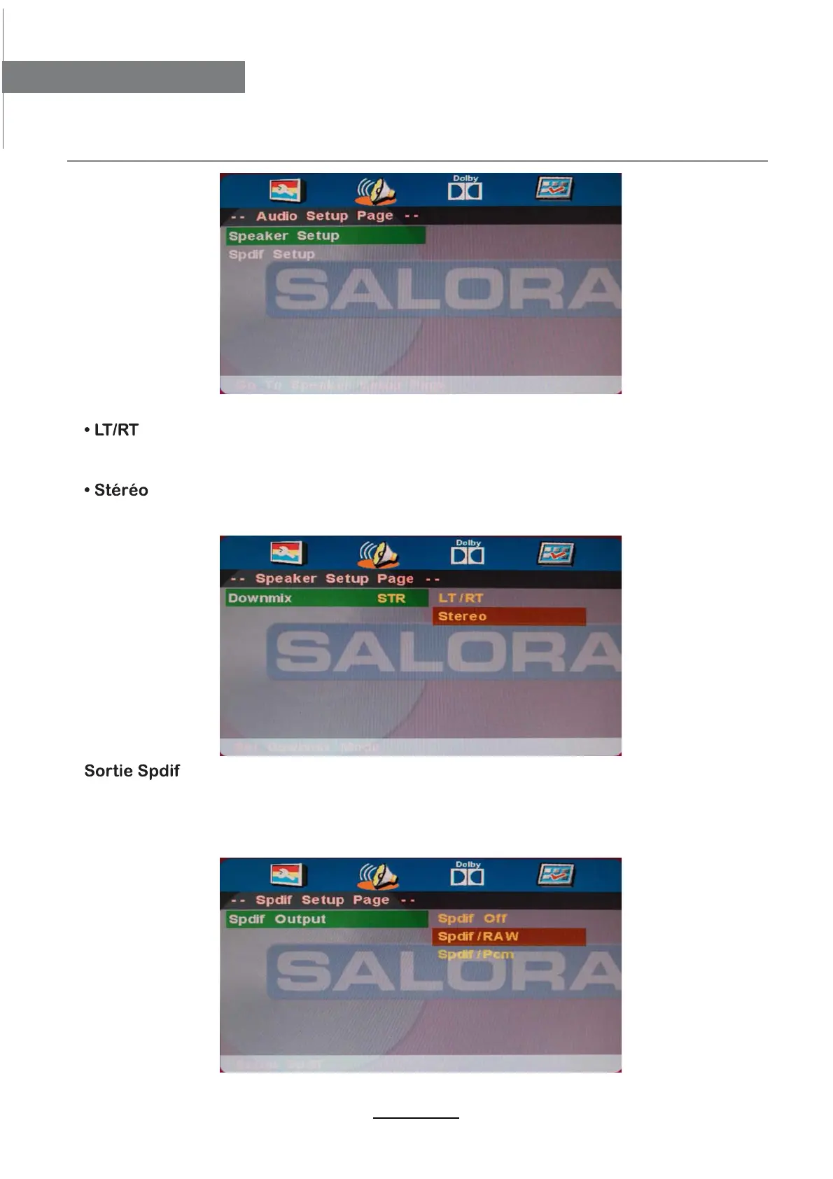 Il existe 3 modes de sortie audio optionnels : SPDIF OFF, SPDIF/RAW et SPDIF/PCM.