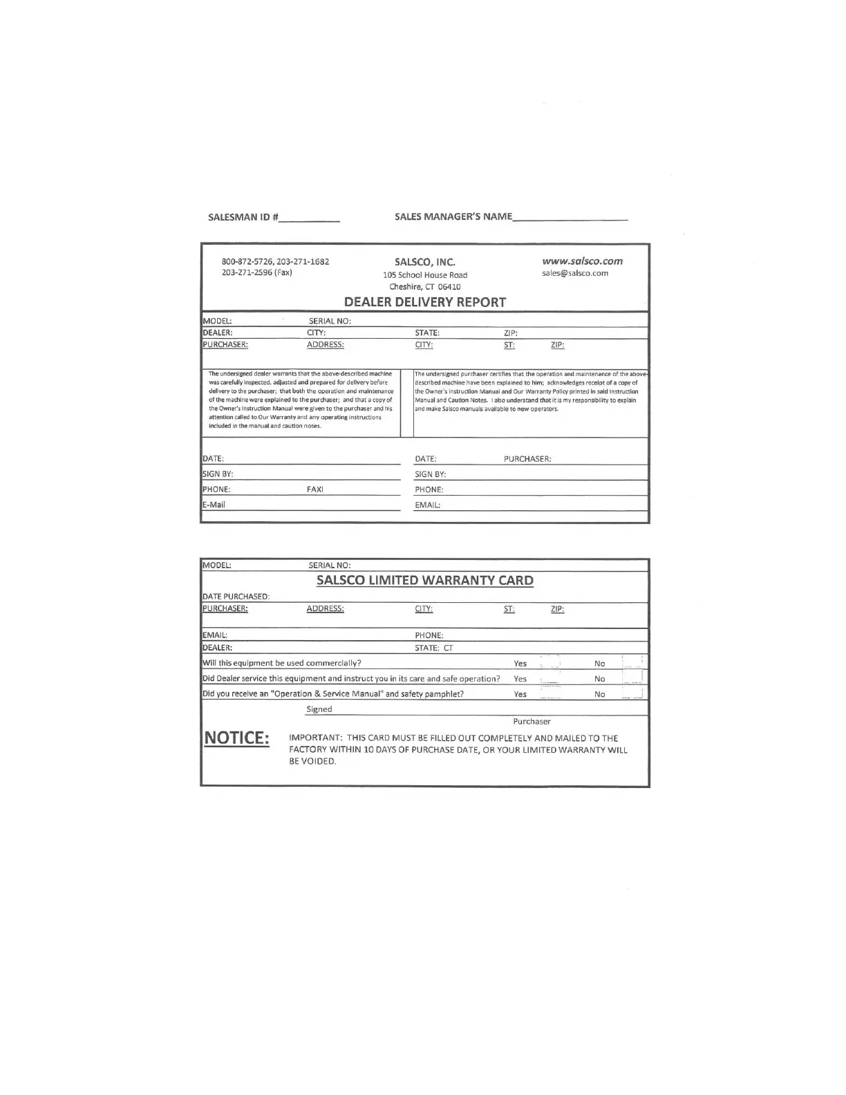 Salsco HP11 - Dealer Delivery Report & Warranty Card