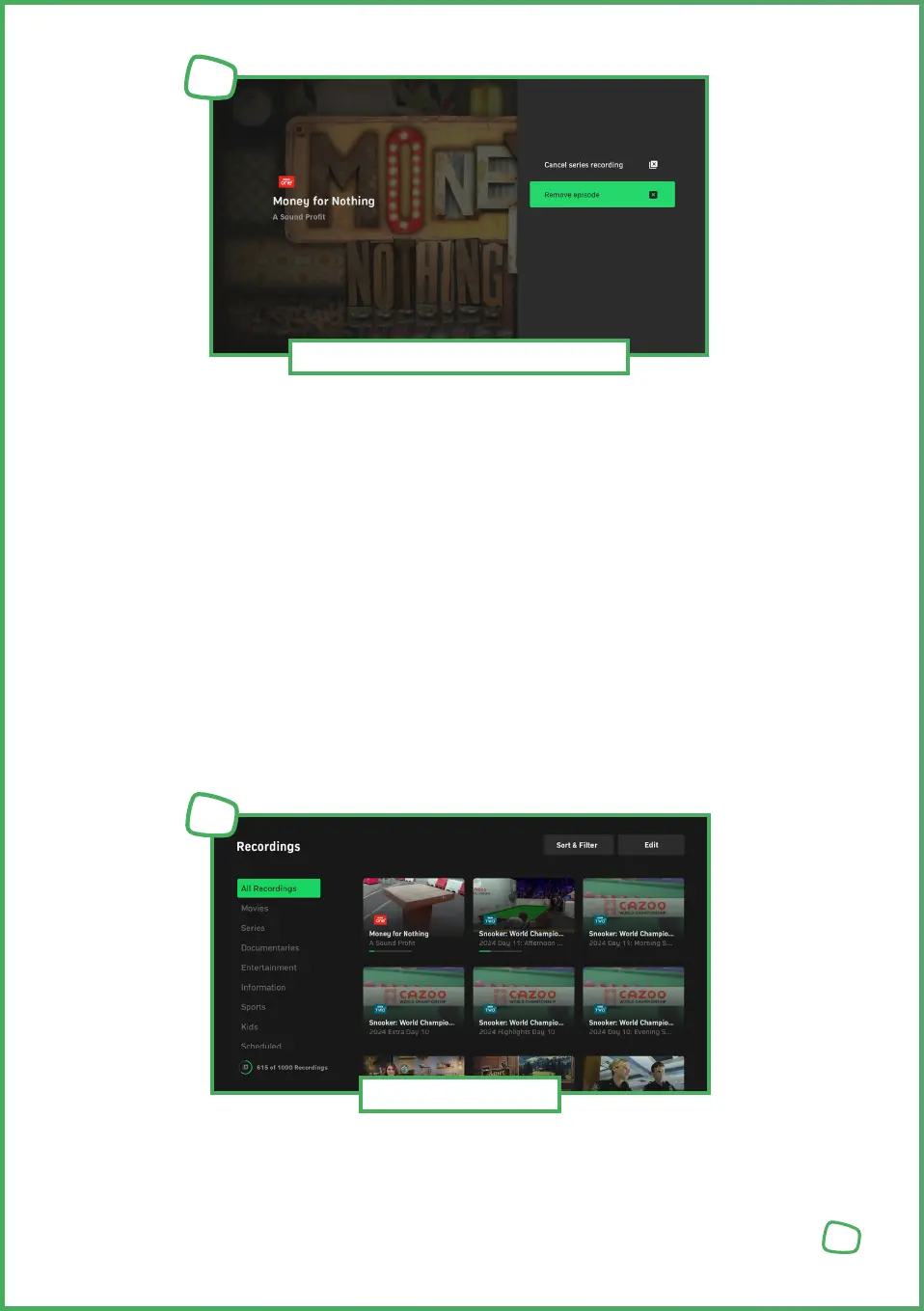 „Recordings“ lists all available and scheduled recordings. You can