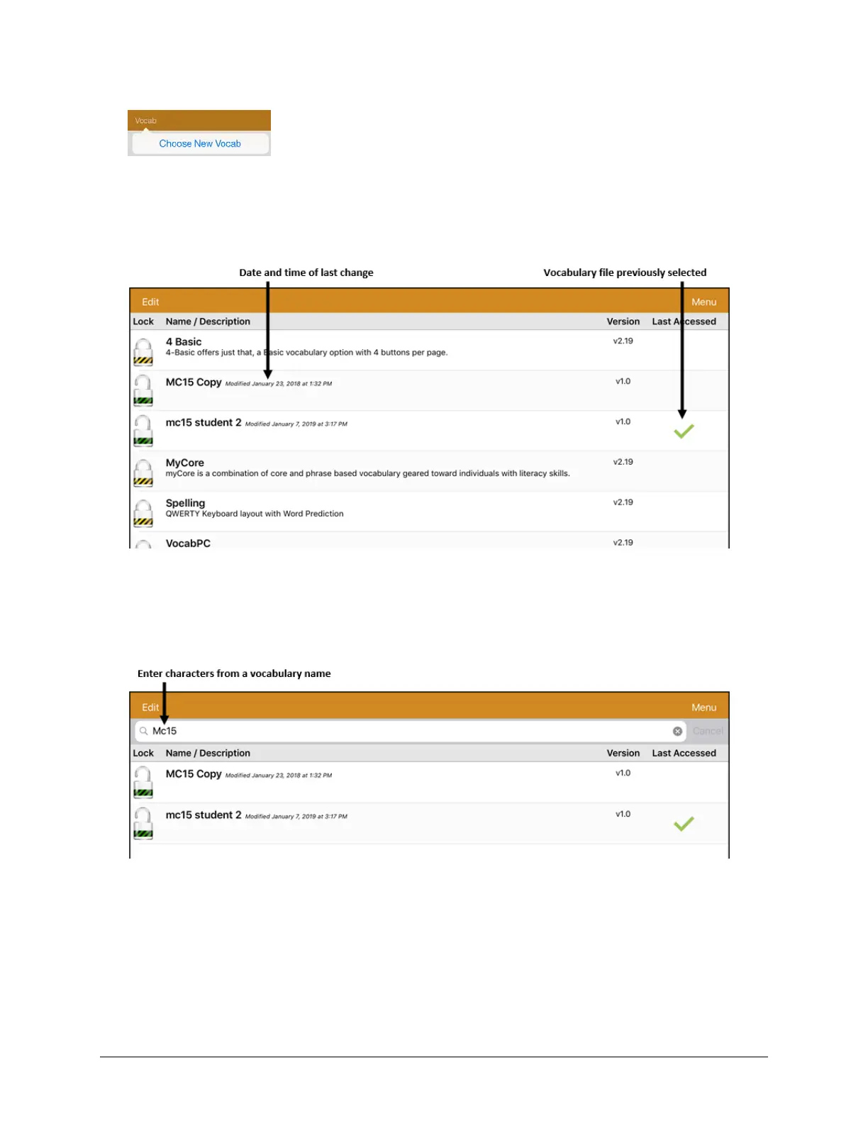 2. Tap Choose New Vocab. A page will list the available vocabulary files.