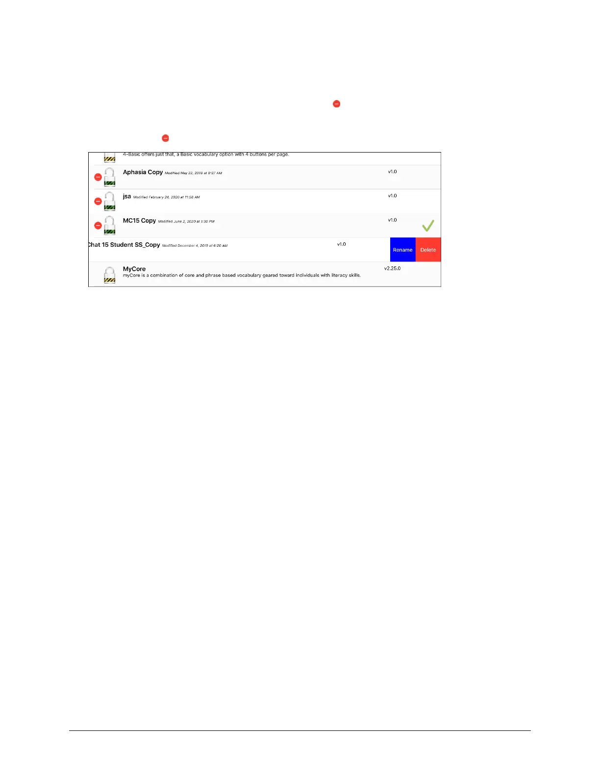 3. Tap the red icon next to the file you want to delete. Rename and Delete buttons will appear.