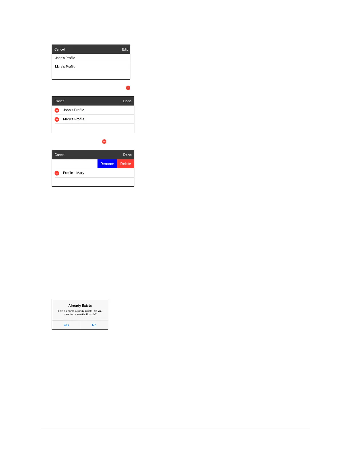 3. Tap the delete icon for the profile you want to rename. Rename and Delete buttons will appear.