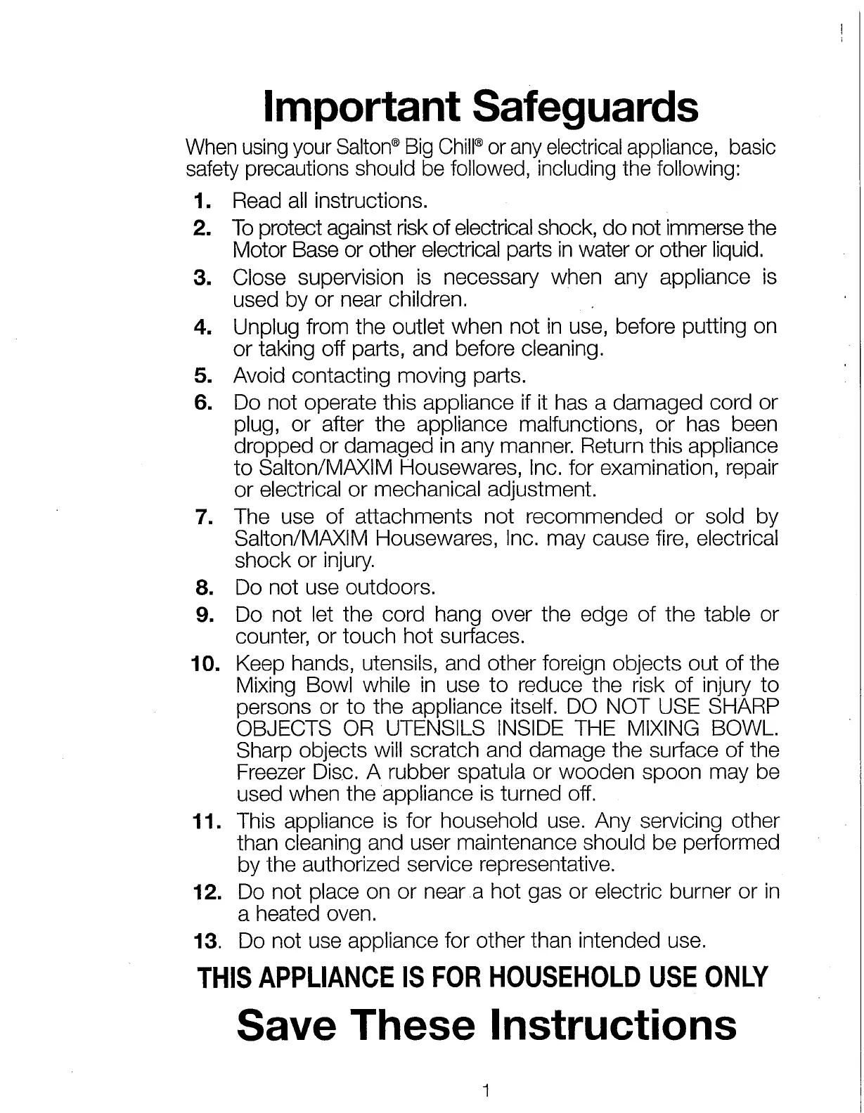 Salton Big Chill ICM21 - Important Safeguards