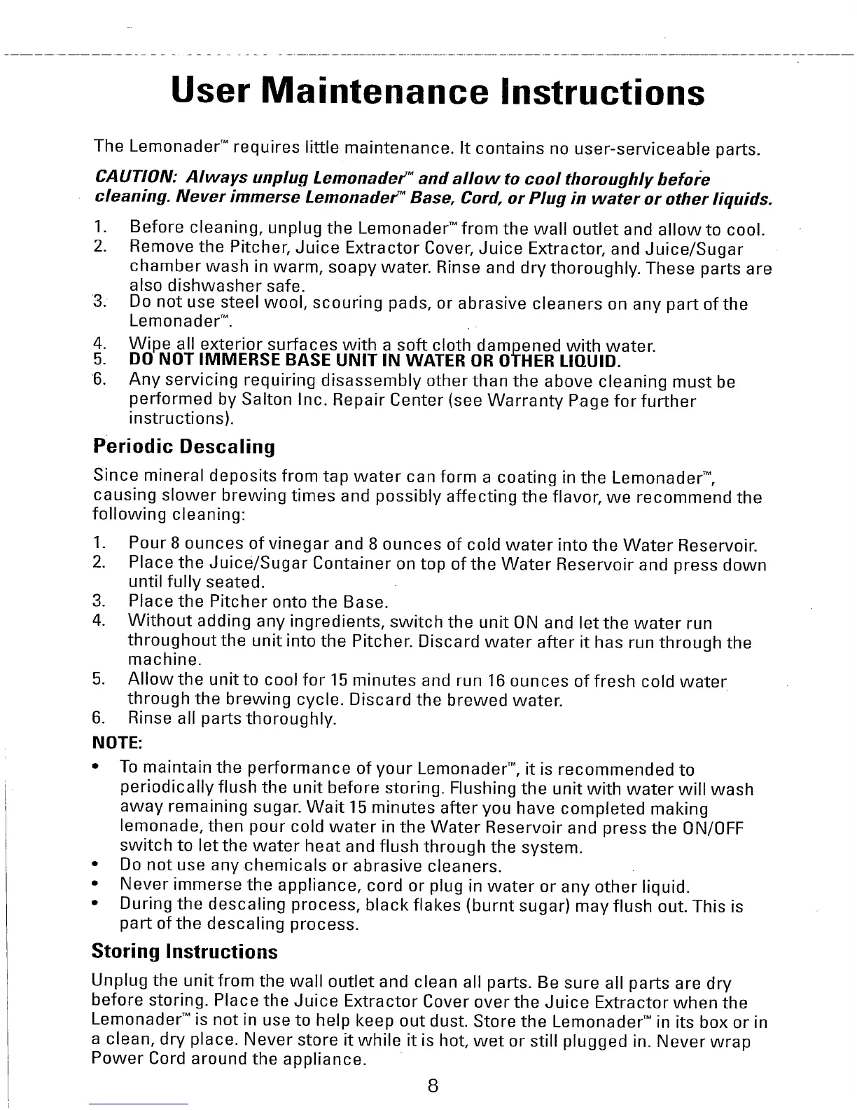 Salton LM8 - User Maintenance Instructions; Periodic Descaling; Storing Instructions