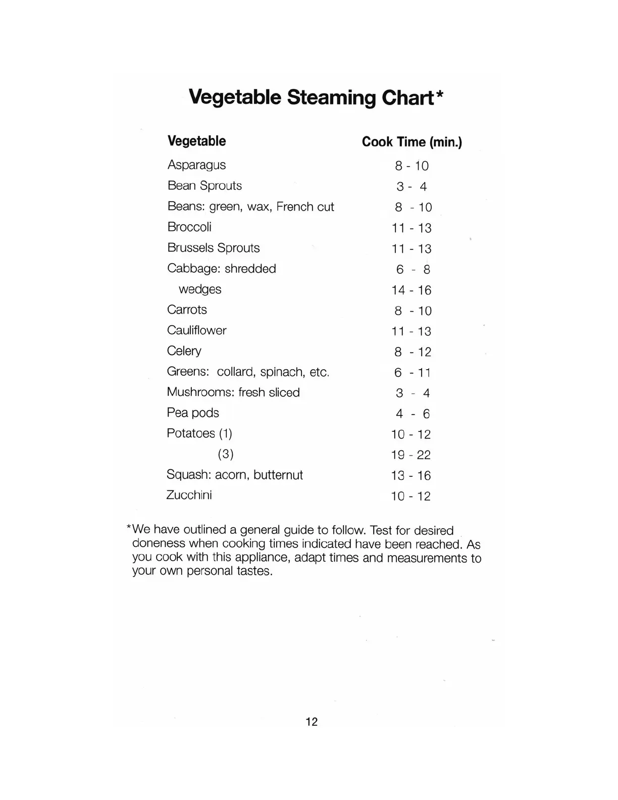 Salton RA3A - Vegetable Steaming Chart
