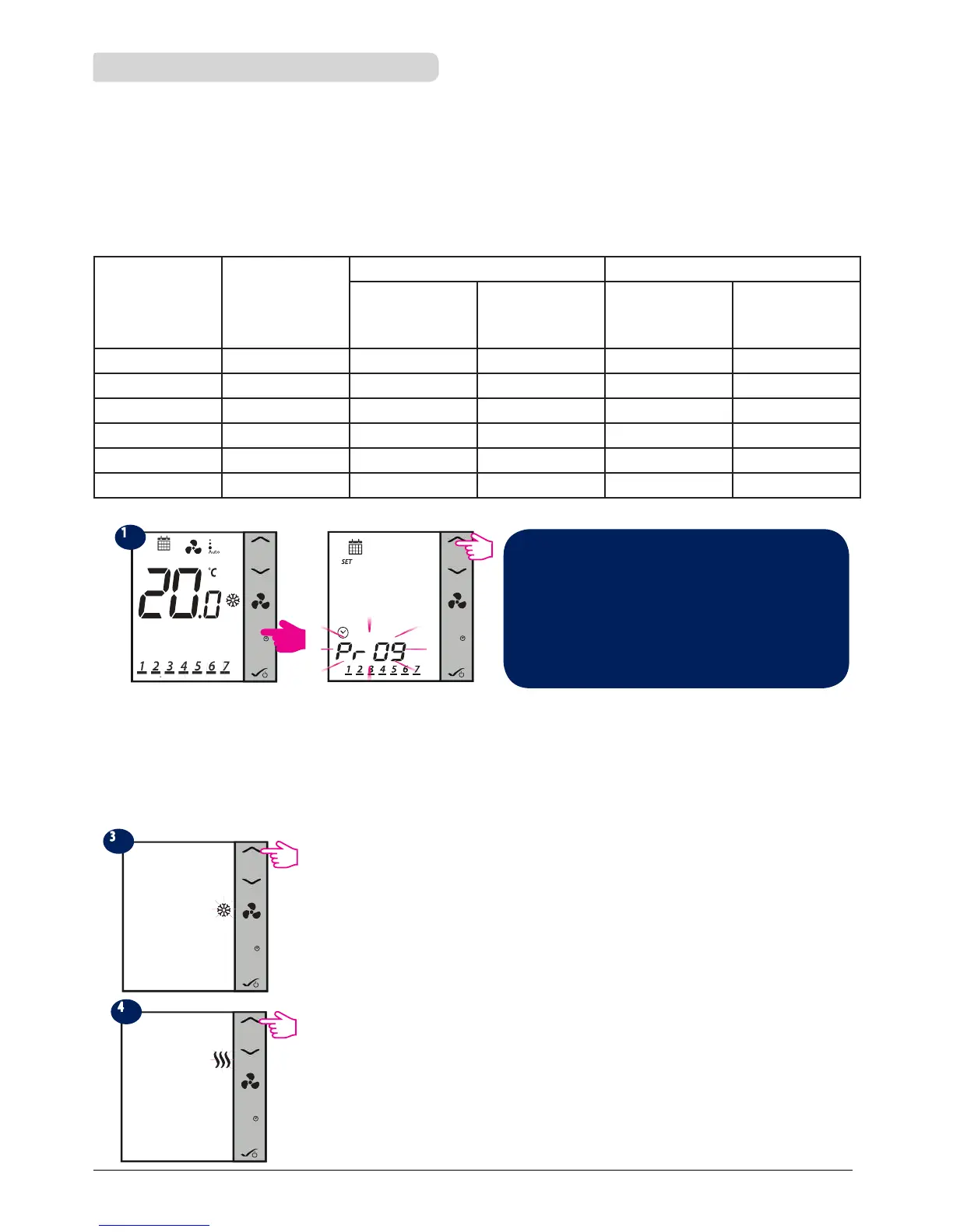 Default Program time and setpoints (for Heating, Cooling and mode and Auto modes) for 2/4 pipe conguration