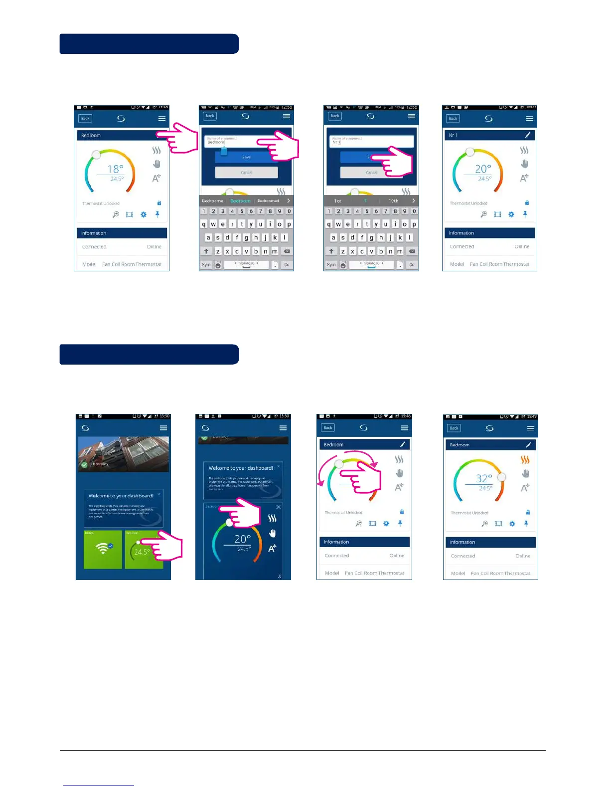 Tap pencil icon. Enter a new name. Tap Save. Thermostat renamed.