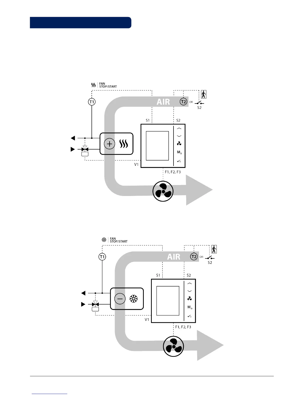 Below you can find some possible usage diagrams for the Fan Coil thermostat, depending on the on your