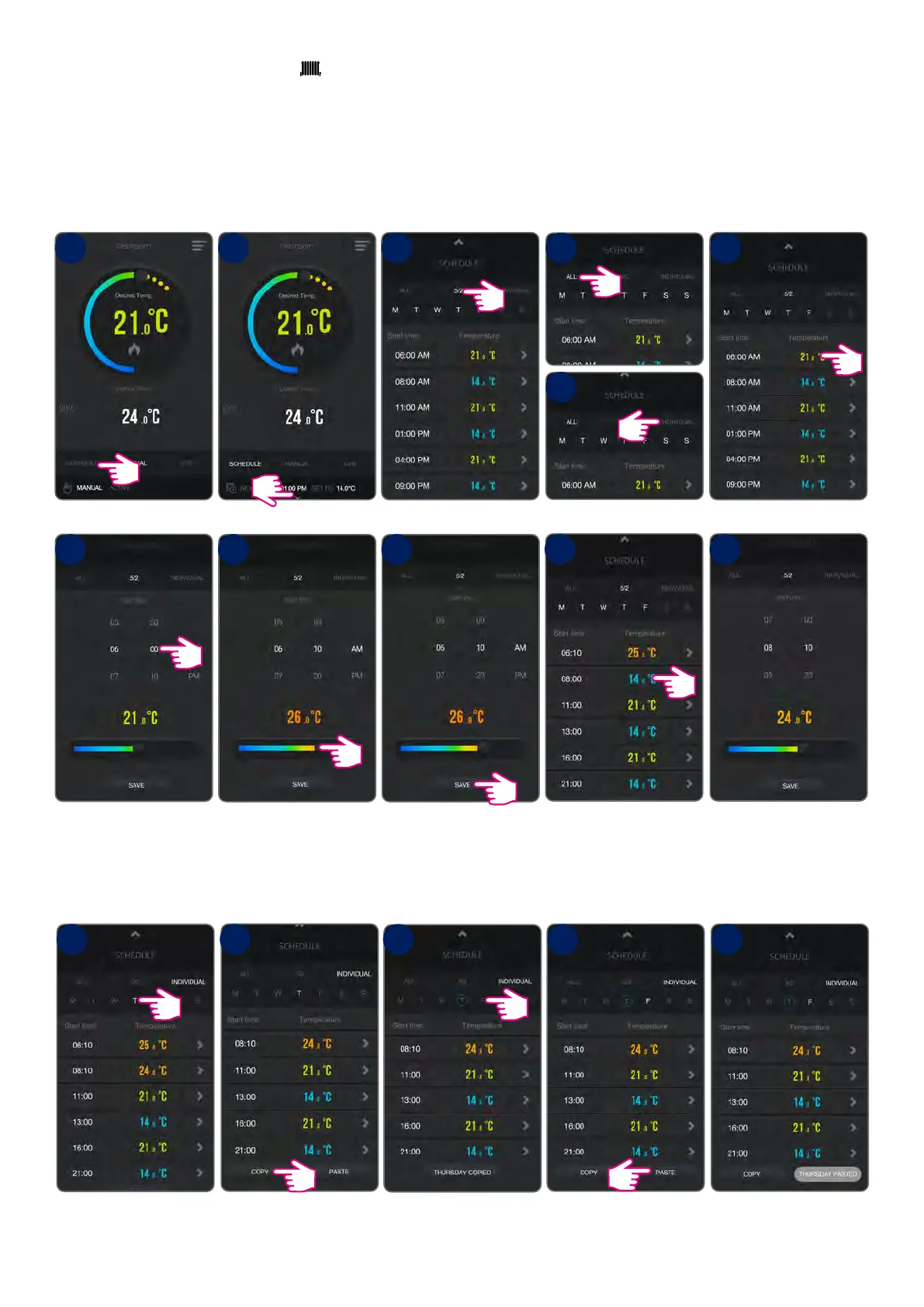 By default thermostat is in Manual Mode. Switch to Schedule Mode to programm a schedule. Note that there are 3 types of schedules. Each schedule