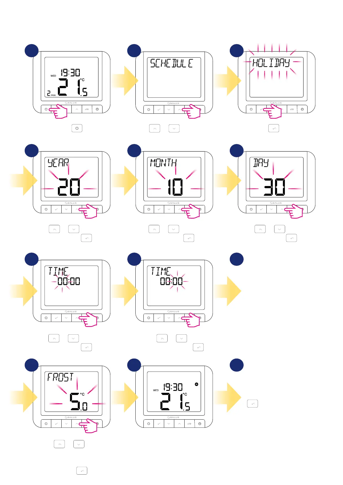 Holiday mode is a special program temperature setpoint which thermostat will maintain for specied days. How to set HOLIDAY MODE: