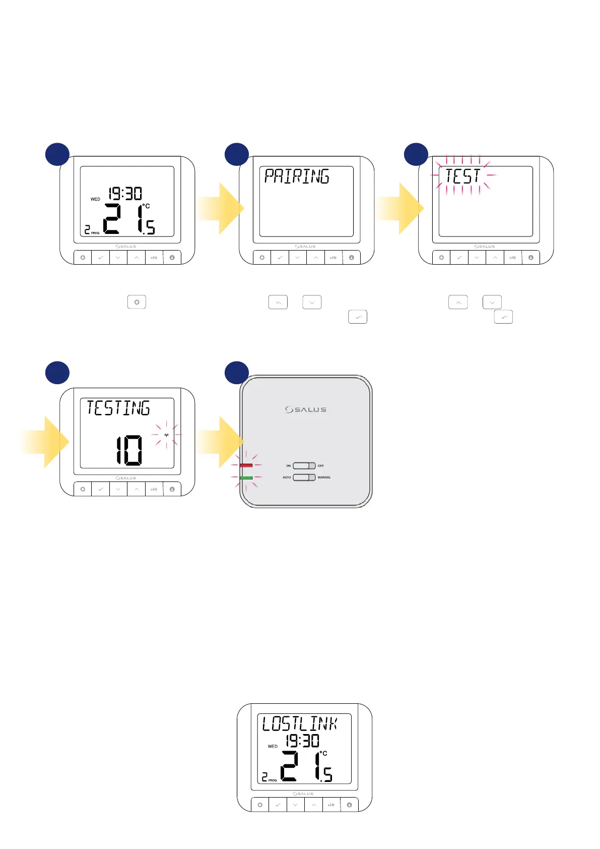 When the transmitter (thermostat) loses connection with the receiver, i.e. is too far away or not paired, the message LOSTLINK will appear on the main
