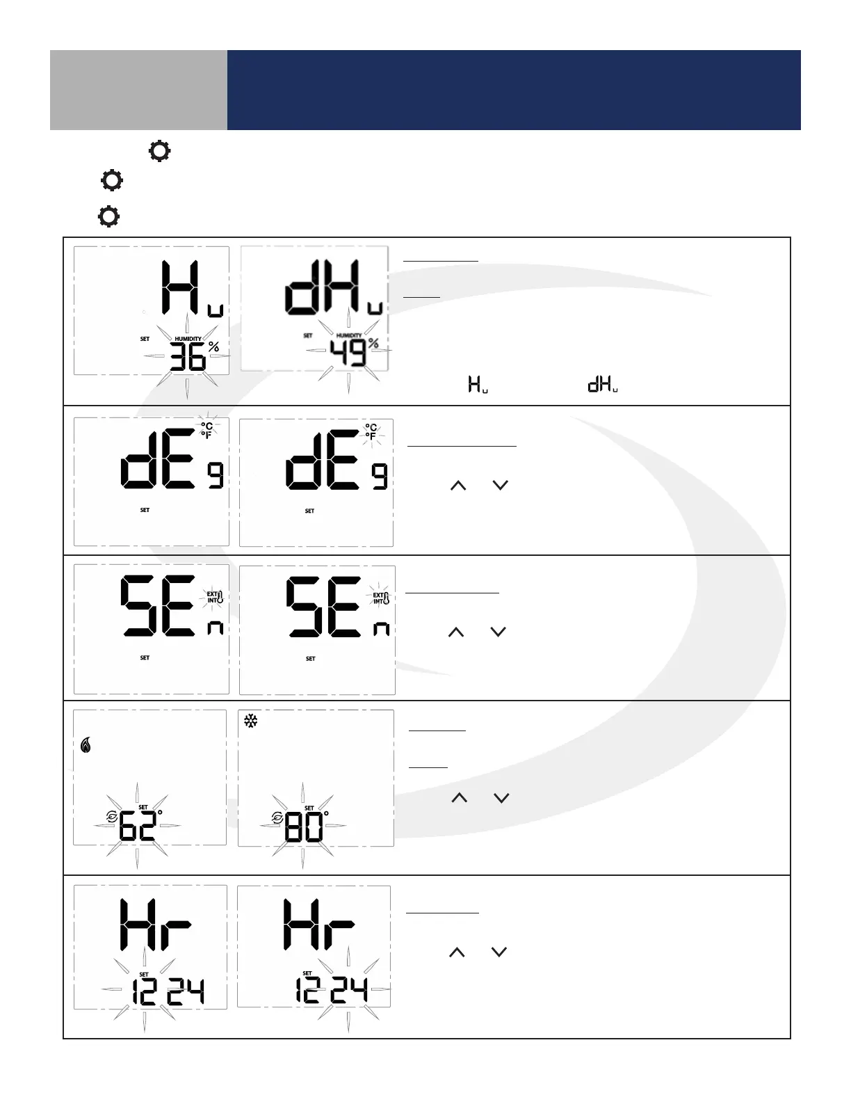 SELECT to choose the flashing value and move to the next setting.