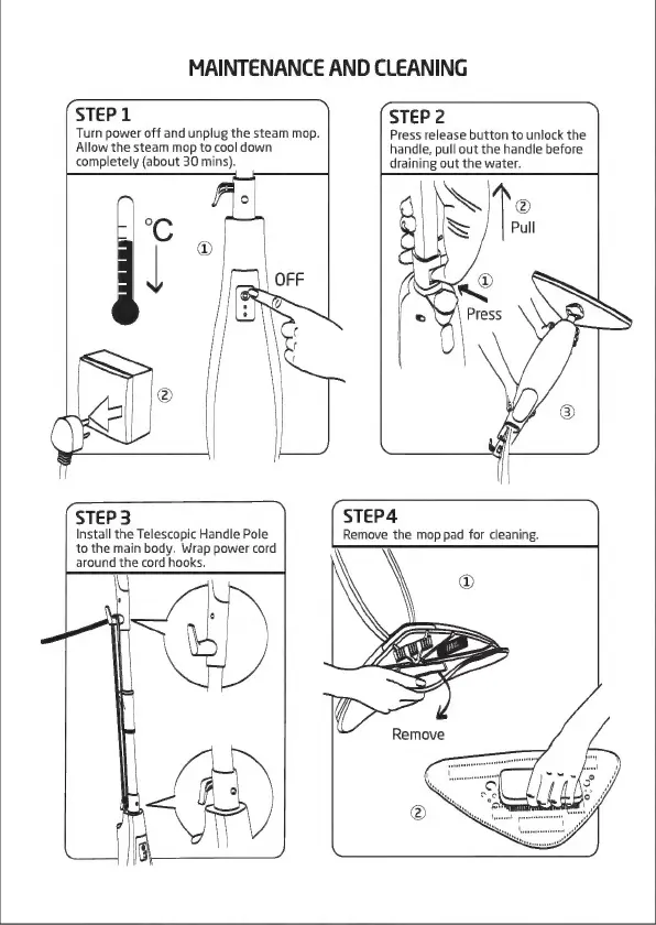 Salva STM-402 - Maintenance and Cleaning; Cooling Down and Power Off; Draining Water Reservoir; Storing the Handle and Cord
