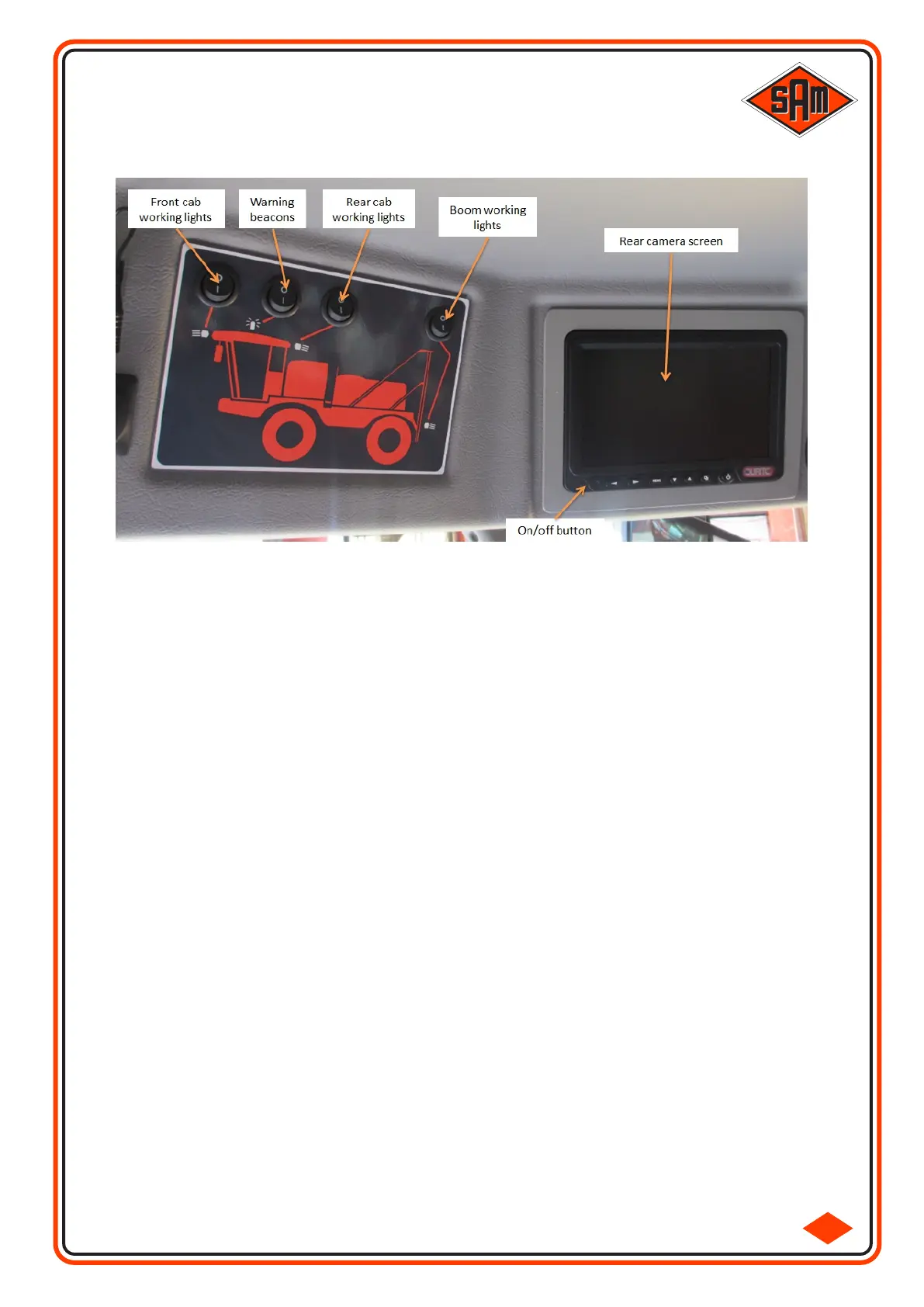 The left panel identifies the four switches which operate the front/rear cab working lights, the warning beacons