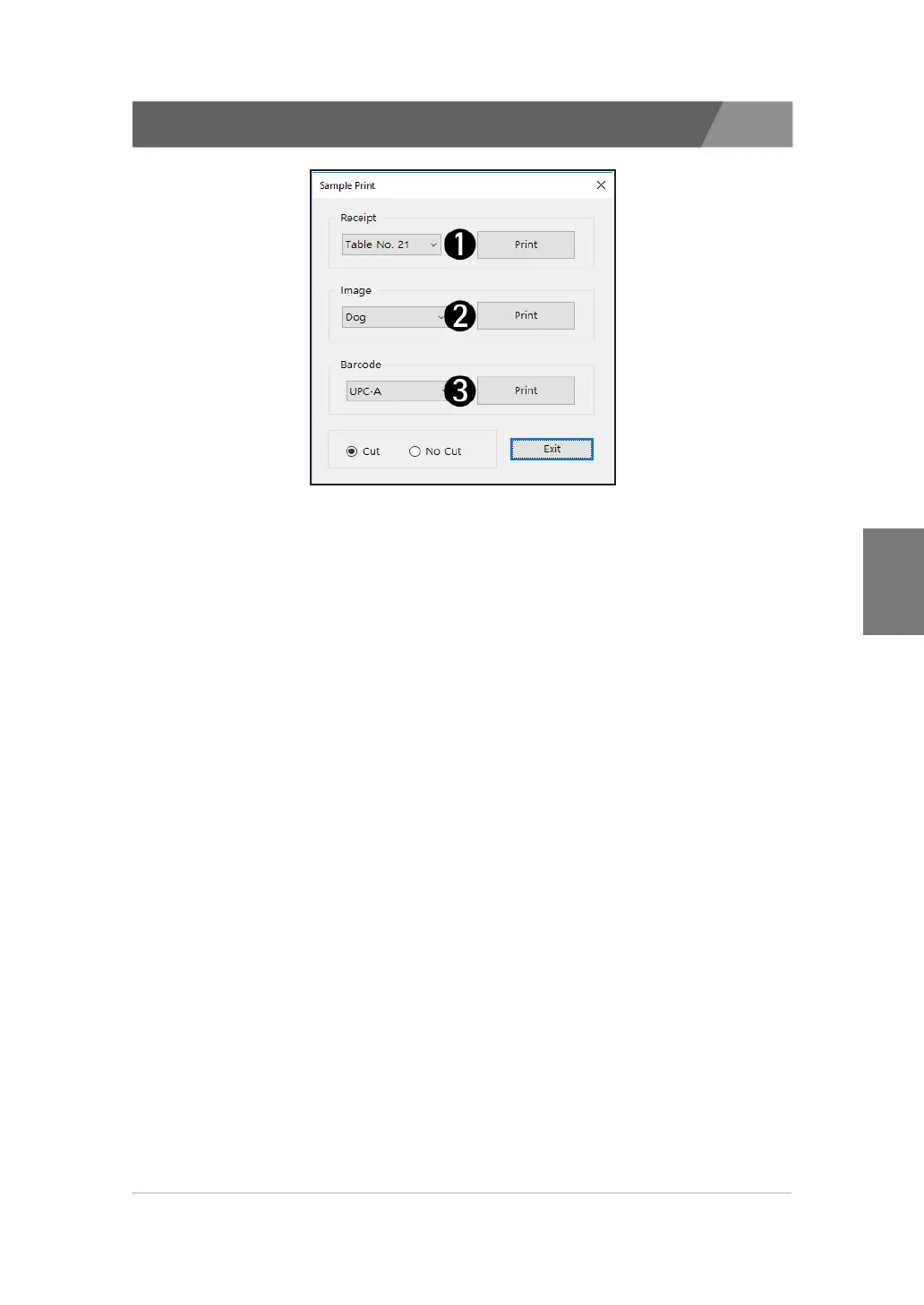 There are three receipt samples. If you select the cut, receipt sample will be cut.