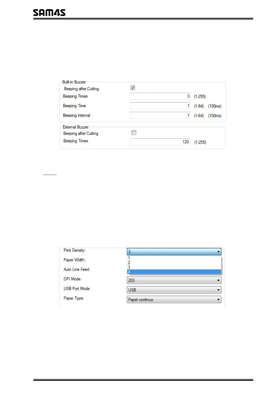 Click the items to set “Print Density”, “Paper Width”, “Auto Line Feed”, “DPI Mode”, “USB Port