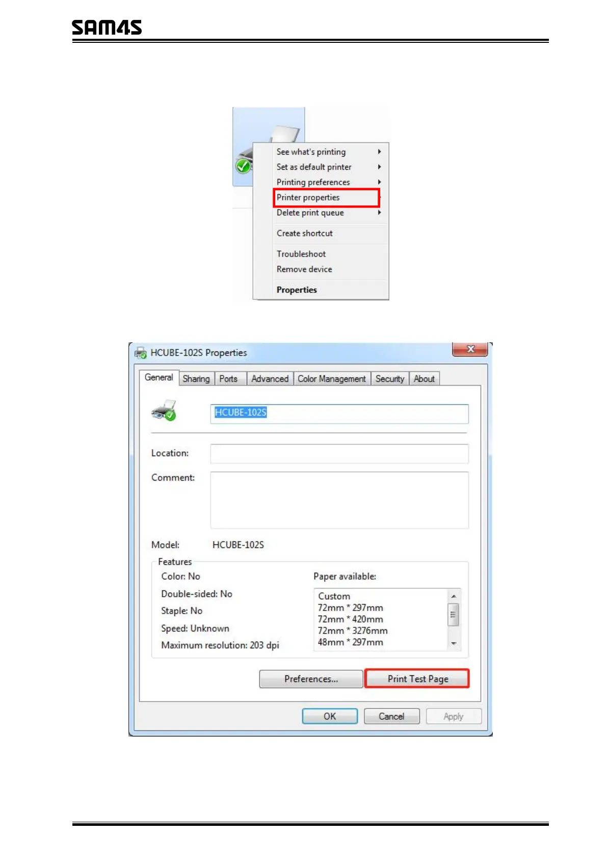 Select Printer properties, click “Print Test Page” to view the printing effect.
