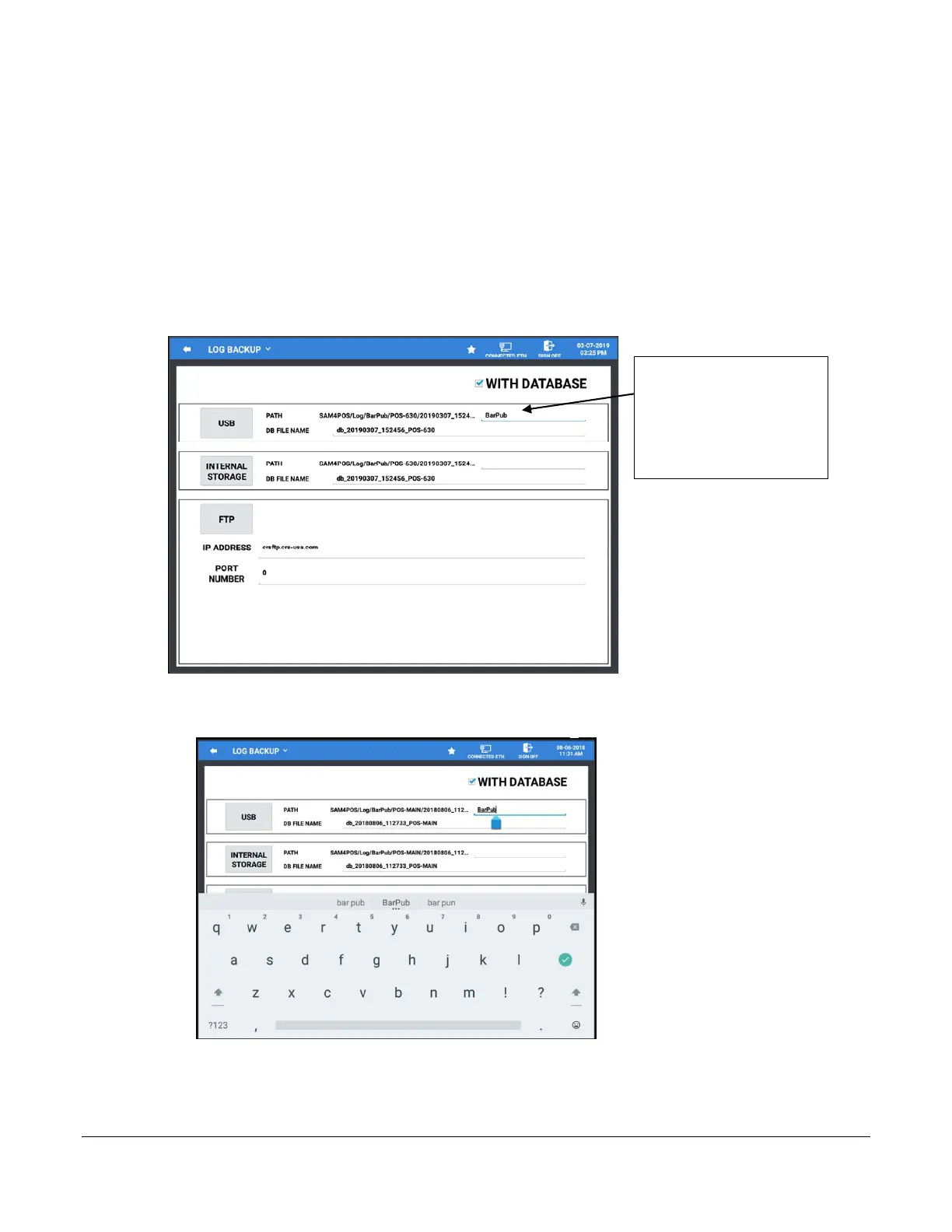 backup provides a means to save log data and database files to a USB drive or Internal Storage.