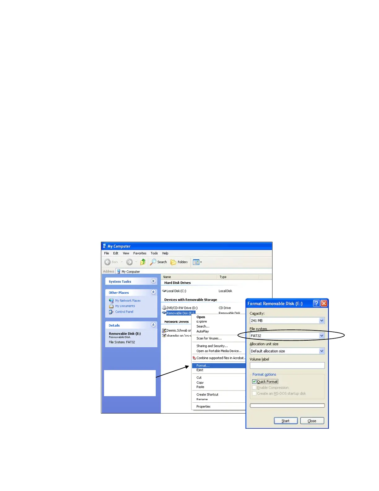 2. Select the SD card drive, right click and select Format. (Win XP screen shown;