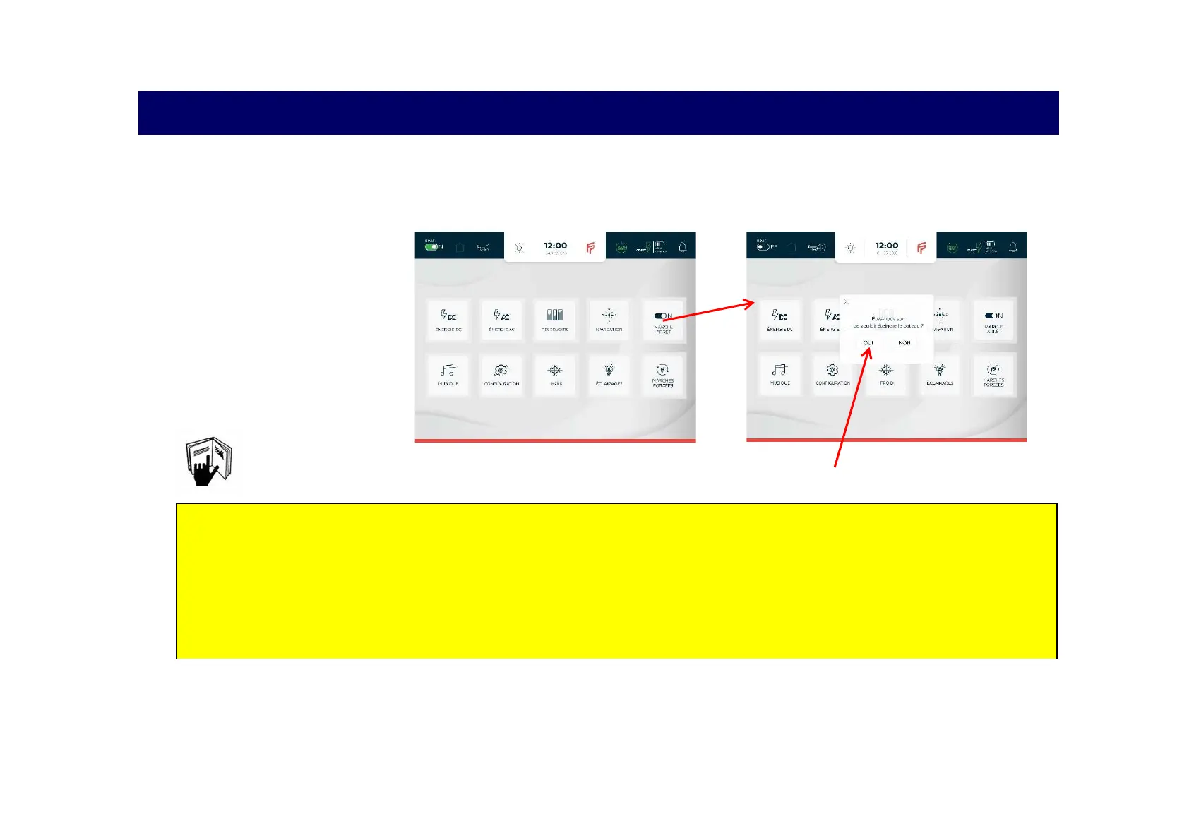When embarking and leaving the boat, the power supply must be ON and OFF from the control panel at the chart table