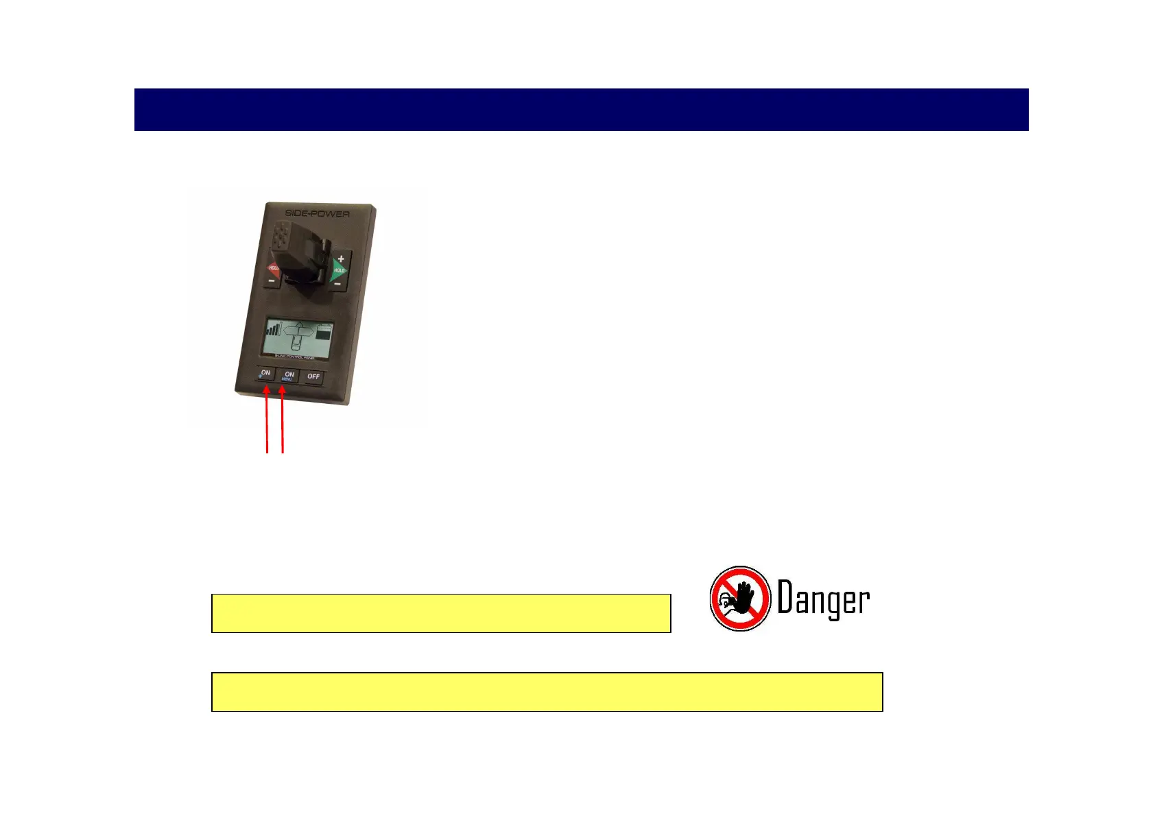 To start the bow thruster, press both 'ON' buttons simultaneously at the starboard wheelhouse.