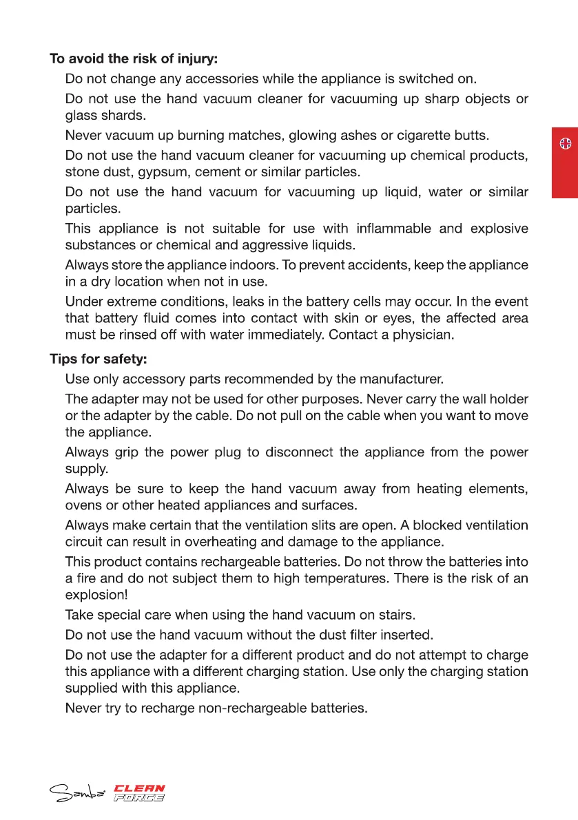 Samba CLEAN FORCE - To avoid the risk of injury; Tips for safety