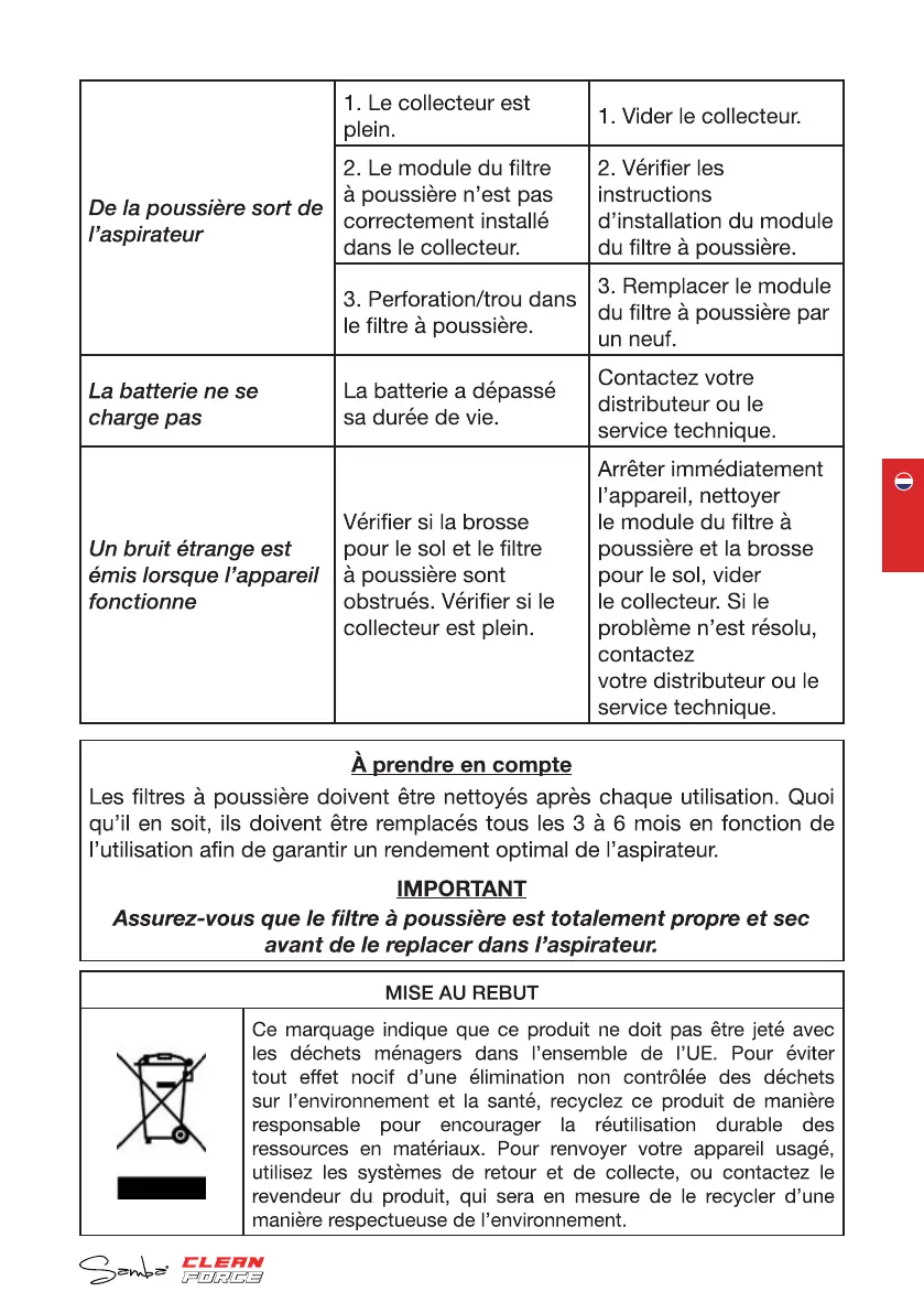 l’utilisation an de garantir un rendement optimal de l’aspirateur.