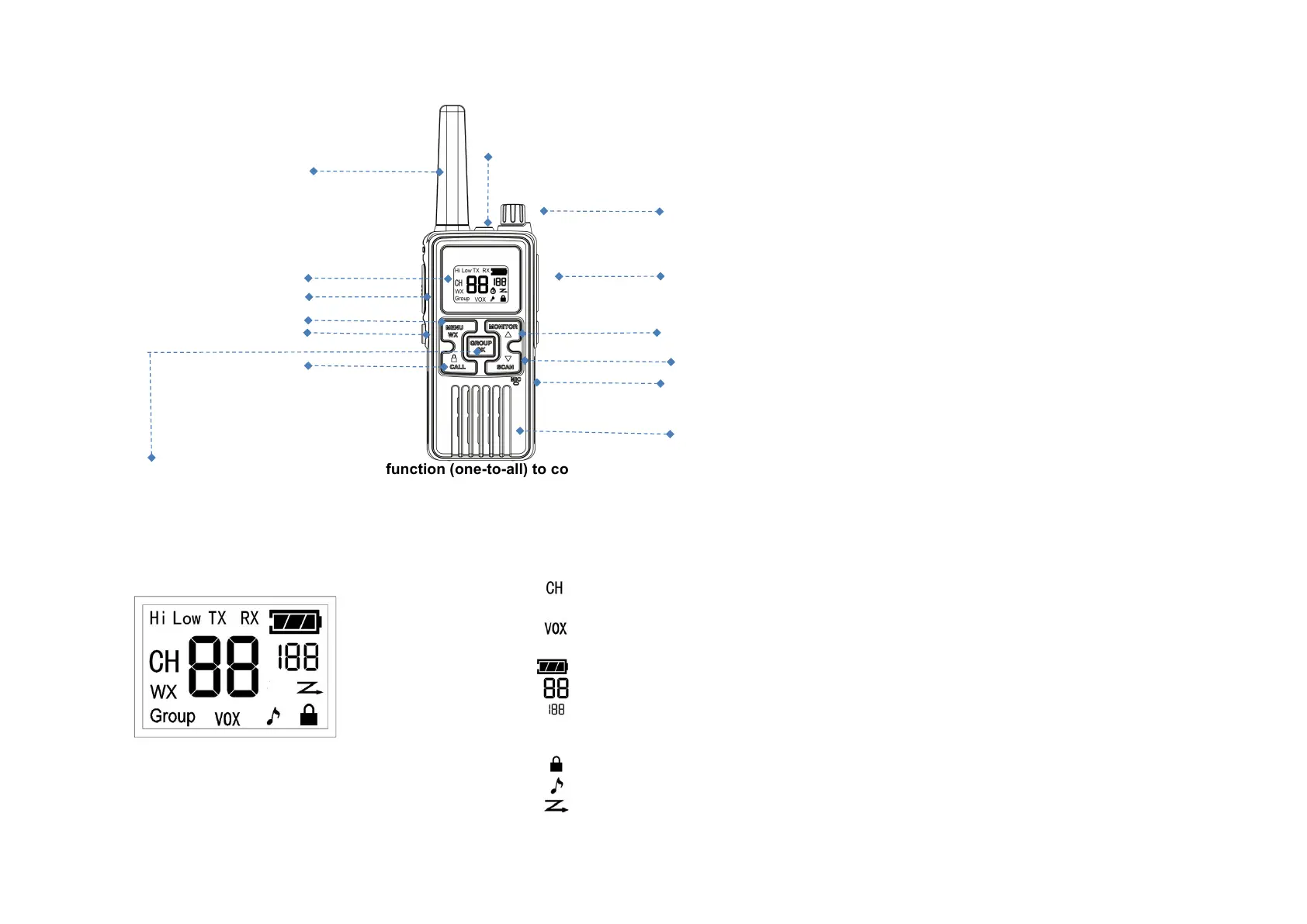 ● GROUP Button – A broadcasting function (one-to-all) to communicate with all other radios that are