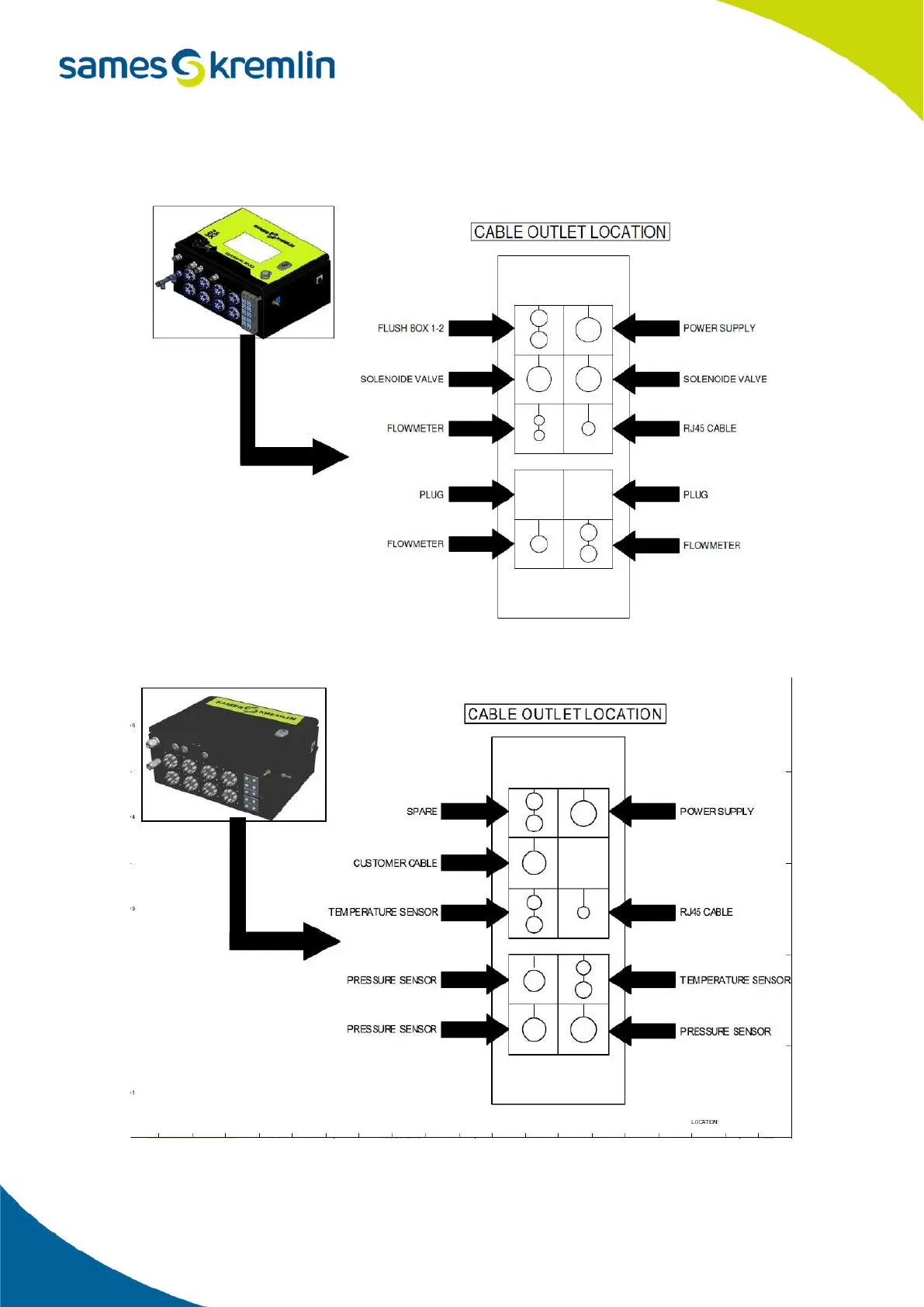 SAMES KREMLIN Cyclomix Evo - Location of Cable Outlets in the Main Box; Location of the Additional Box Cable Outlets